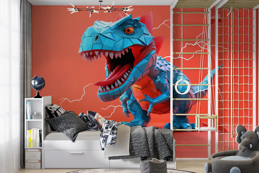 De opvallende rode achtergrond laat de blauwe geometrische dinosaurus moeiteloos knallen. Het is bijna alsof je hem kunt horen brullen! Geweldig om diepte en opwinding toe te voegen aan elke ruimte, of het nu een gedurfde woonkamer, een avontuurlijke kinderslaapkamer of een eigenzinnig kantoor is.