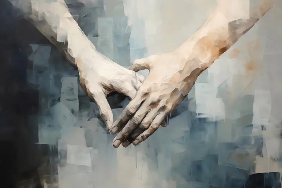 Stel je eens voor dat je een kamer binnenstapt die zowel uitnodigend als rustig aanvoelt, allemaal dankzij deze prachtige muurschildering, “Hands Connecting in Gentle Embrace”. Het kunstwerk fluistert van verbondenheid en warmte, als een knuffel voor je muren. Elke hand lijkt een verhaal te vertellen en nodigt iedereen die het ziet uit om na te denken over hun eigen relaties.