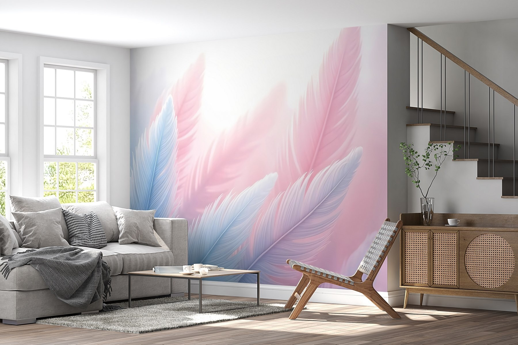 Verander elke ruimte in een dromerig toevluchtsoord met deze betoverende muurschildering, “Groep veren in licht”. Stel je voor: zachte pasteltinten die sierlijk over je muren zweven en een sfeer creëren die zo licht als lucht aanvoelt. Het is alsof je een zacht briesje vastlegt als kunst! De delicate veren van deze muurschildering roepen een gevoel van rust en eigenzinnigheid op, perfect voor een knusse leeshoek of een rustige slaapkamer. Stel je voor dat je wegzakt in je favoriete stoel, verloren in een boek, met deze mooie veren details die je omhullen in sereniteit. Het is net alsof je door een mistige tuin wandelt – helemaal sereen. En wie houdt er niet van een goed verenthema? Het is alsof je de hemel binnenhaalt zonder het risico op vogelpoep!