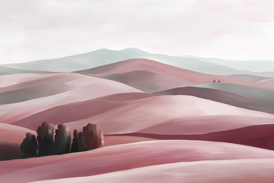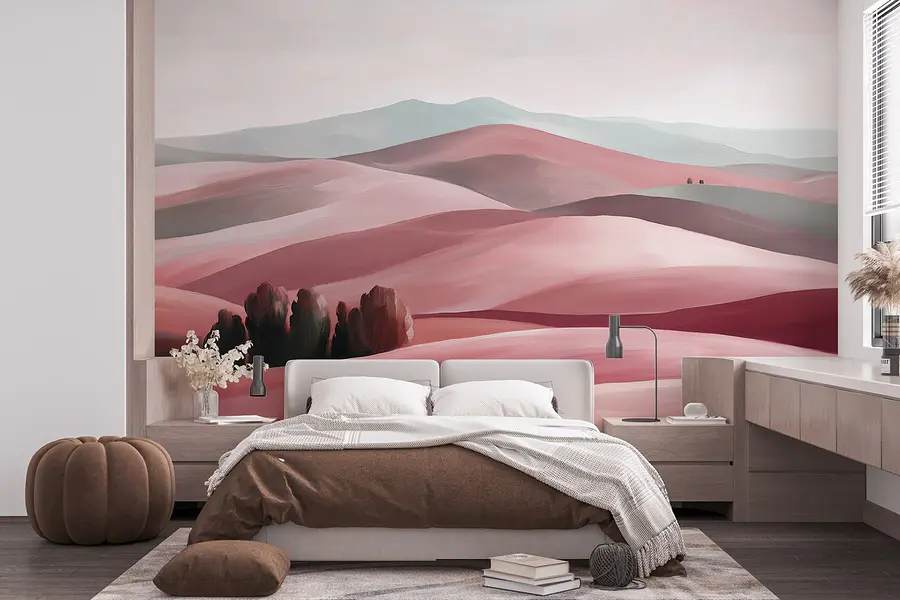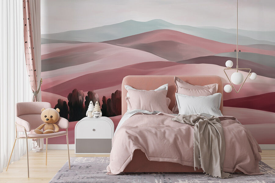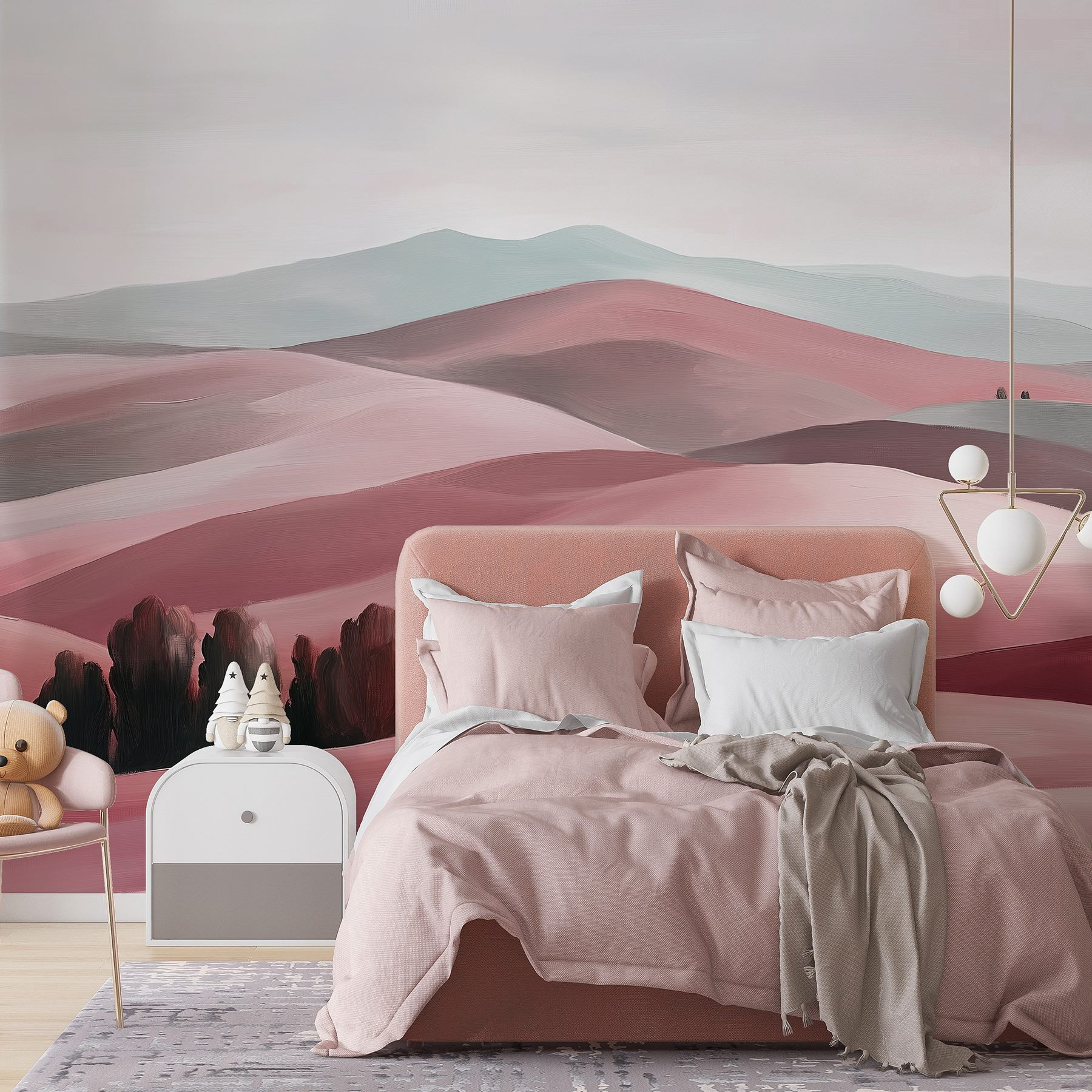 Verander een gewone muur in een dromerige ontsnapping met de muurschildering “Landschap van heuvels met bomen”. Stel je voor dat je een kamer binnenloopt die direct aanvoelt als een serene plek waar zachte heuvels onder een zachte hemel rollen. De subtiele roze en grijze tinten nodigen uit tot rust en warmte, perfect voor gezellige praatjes of dagdromen met een kopje thee.