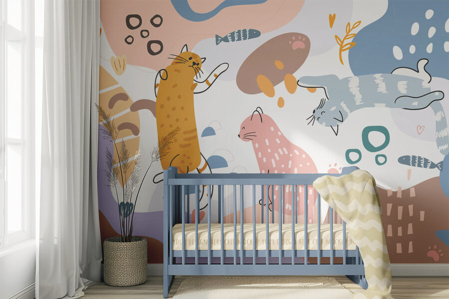 Transformeer elke ruimte met deze vrolijke muurschildering met een levendige groep katten op een kleurrijke achtergrond. Stel je een luie middag voor waar die schattige haarballen een glimlach toveren op iedereen die langsloopt. Het speelse ontwerp voegt een vleugje eigenzinnigheid toe, perfect voor een gezellig hoekje of zelfs een lichte woonkamer. Katten loungen, strekken zich uit en plannen misschien hun volgende snackpauze – wie zou daar niet om grinniken? Met een heerlijke balans van kleuren creëert het een warme, uitnodigende sfeer. Het is net alsof je een zachte katachtige omhelzing op je muur hebt!