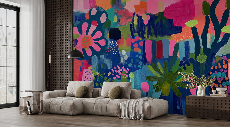 Stel je voor dat je een kamer binnenloopt en je wordt omringd door een gezellige, kleurrijke omhelzing van planten en bloemen – dat klinkt dromerig, toch? Deze muurschildering is eigenlijk een tuinfeest voor je muren. Levendige kleurspatten dansen samen en creëren een vrolijke warboel die alleen een echte kunstenaar kan perfectioneren. Het voelt alsof je door een grillige tuin wandelt zonder dat je groene vingers nodig hebt. Perfect om elke kamer een vleugje leven te geven – het is een muurknuffel waar je je goed bij voelt. Kom op, laat je muren bloeien!