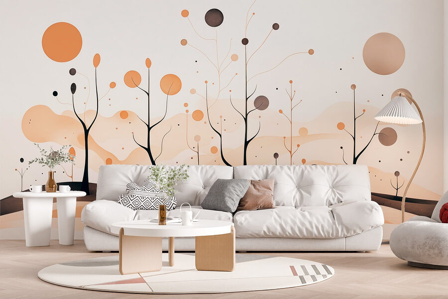 Verander elke ruimte in een sereen toevluchtsoord met deze boeiende muurschildering met grillige bomen en zachte, vloeiende vormen. Stel je voor dat je in een dromerig landschap stapt telkens als je de kamer binnenloopt. De warme kleuren van zacht oranje en aardebruin creëren een gezellige sfeer, perfect om creativiteit te inspireren of gewoon om tot rust te komen na een lange dag.
