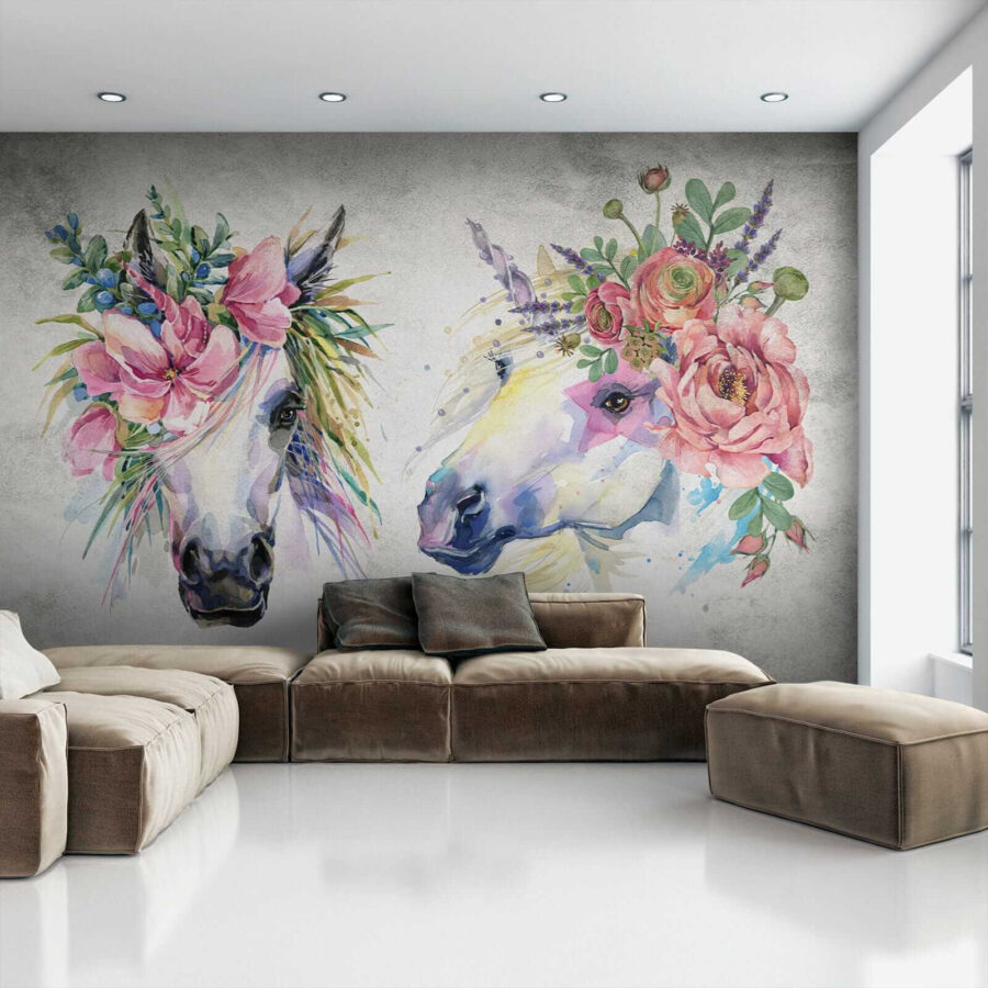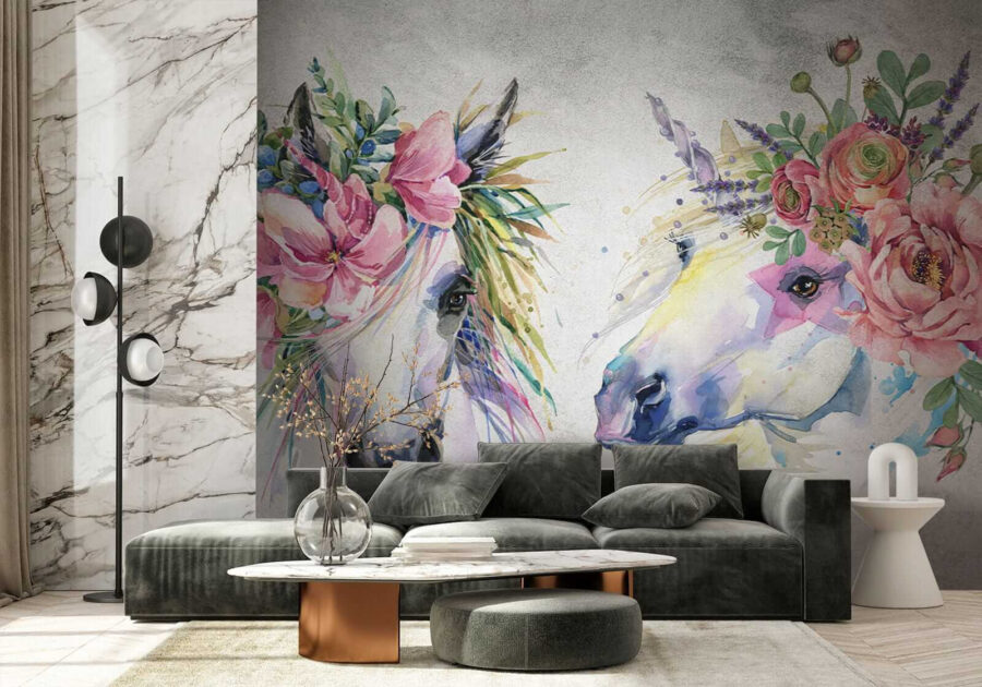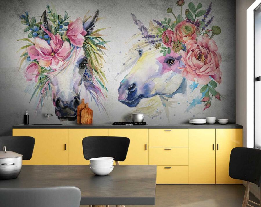 Stel je voor dat je een kamer binnenloopt en begroet wordt door deze prachtige paarden versierd met bloemenkronen! Deze levendige muurschildering brengt een uitbarsting van kleur en eigenzinnigheid in elke ruimte – perfect voor een kinderkamer, een kinderkamer of zelfs een creatieve studio. Het aquarelgevoel is dromerig, bijna alsof je een sprookjestuin bent binnengestapt. De delicate bloemen en expressieve ogen van de paarden voegen een vleugje magie en sereniteit toe dat moeilijk te weerstaan is.