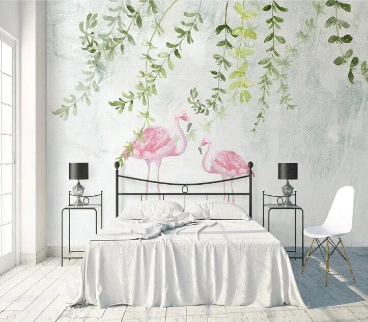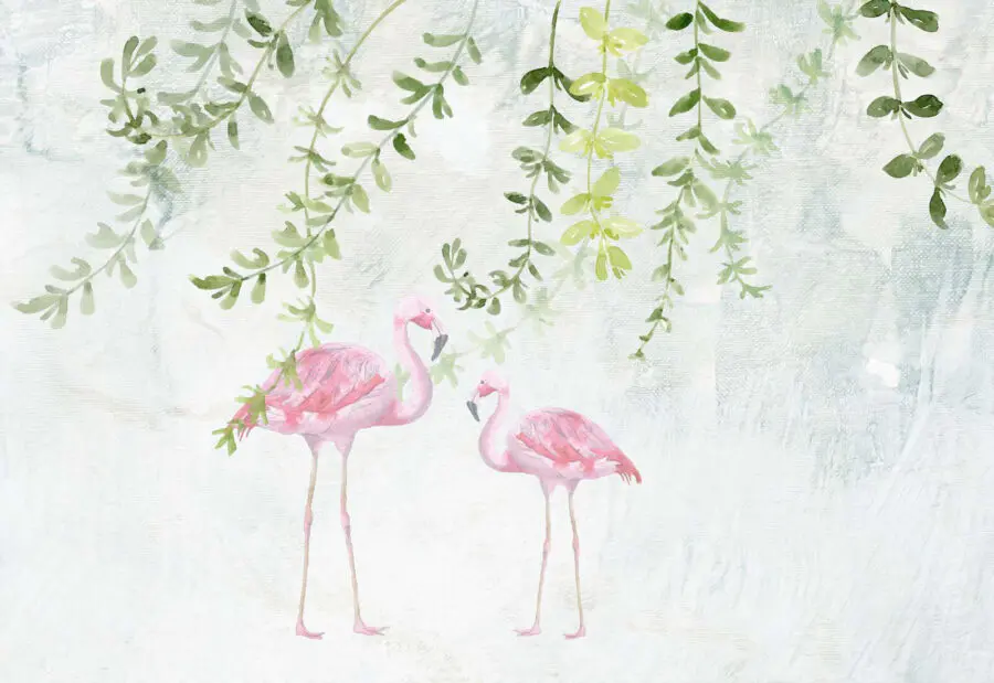 Stel je eens voor dat je een kamer binnenloopt en begroet wordt door deze dromerige muurschildering van twee flamingo’s die lekker liggen te chillen onder groene bladertakken. Het heeft een ontspannen, aquarelachtige uitstraling die zowel elegant als een beetje speels is. Perfect voor vogelliefhebbers of iedereen die een vleugje kleur en plezier in hun ruimte wil. Stel je voor: je drinkt je ochtendkoffie en deze flamingo’s staan erbij en geven een sereen, bijna tropisch gevoel. Het is alsof je een kunstwerk en een stukje natuur in huis haalt. Zeker een gespreksstarter voor als er vrienden langskomen!