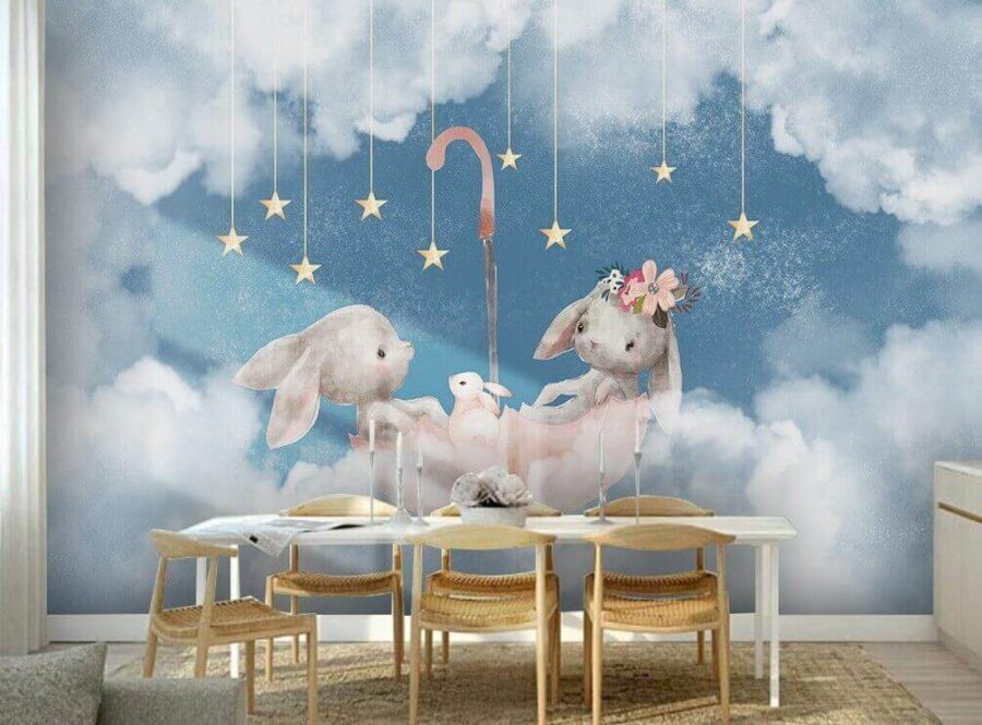 Transformeer uw ruimte met de betoverende charme van ‘Two Rabbits in a Pink Umbrella’. Deze betoverende muurschildering brengt speelse fantasie in elke kamer, met schattige konijntjes die door dromerige wolken zweven, verbonden door een felroze paraplu. Het voelt als een zachte knuffel voor uw muren, perfect om een kinderkamer, speelkamer of zelfs dat gezellige leeshoekje op te fleuren. Stel je voor dat je thee drinkt met deze muurschildering als achtergrond – wie zou daar niet om glimlachen? Het is als een stukje magie dat vreugde opwekt. De zachte kleuren en schattige details nodigen uit tot dagdromen en giechelen, waardoor elke blik een kleine ontsnapping is.