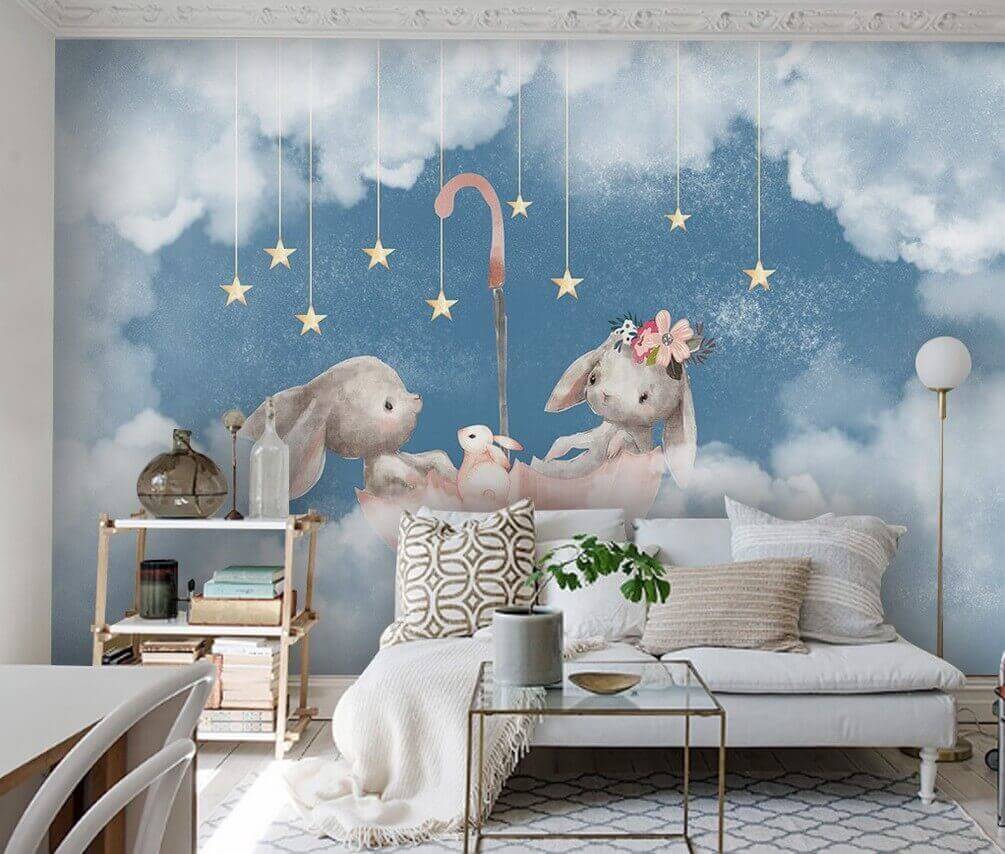 Transformeer uw ruimte met de betoverende charme van ‘Two Rabbits in a Pink Umbrella’. Deze betoverende muurschildering brengt speelse fantasie in elke kamer, met schattige konijntjes die door dromerige wolken zweven, verbonden door een felroze paraplu. Het voelt als een zachte knuffel voor uw muren, perfect om een kinderkamer, speelkamer of zelfs dat gezellige leeshoekje op te fleuren. Stel je voor dat je thee drinkt met deze muurschildering als achtergrond – wie zou daar niet om glimlachen? Het is als een stukje magie dat vreugde opwekt. De zachte kleuren en schattige details nodigen uit tot dagdromen en giechelen, waardoor elke blik een kleine ontsnapping is.