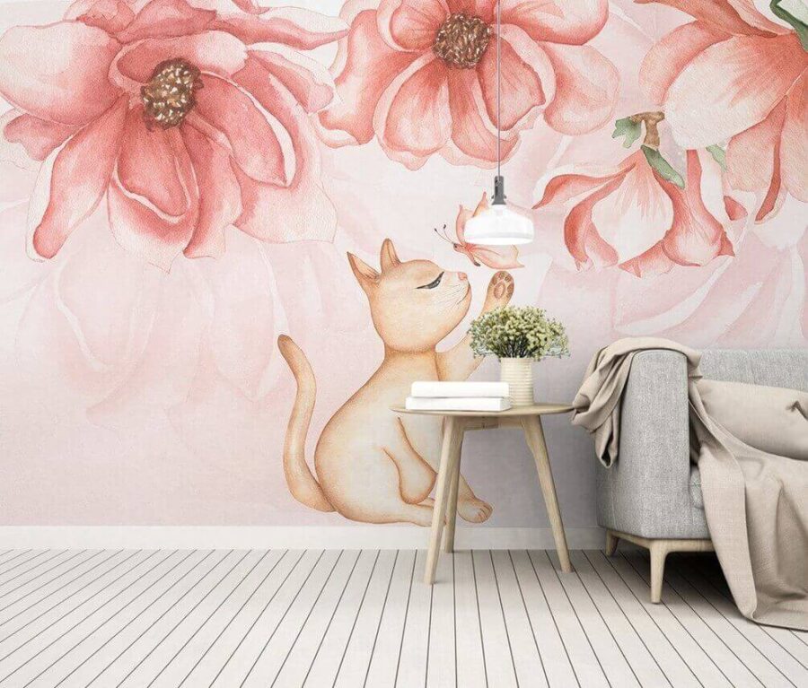 Transformeer uw ruimte met deze betoverende muurschildering met een speelse kat die naar een vlinder reikt. De zachte aquarelstijl en delicate roze bloemen creëren een dromerige sfeer die doet denken aan een wandeling door een zonovergoten tuin. Zie je jezelf al voor je, dromerige middagen met een kopje thee, of misschien een spontane dansparty? Deze muurschildering brengt charme en een vleugje magie in elke kamer. Of het nu voor een gezellig hoekje is of een speelse kinderkamer, het zal zeker een glimlach en warmte oproepen. Wie wil er nu niet het gevoel hebben dat hij in een sprookjesboek is beland?