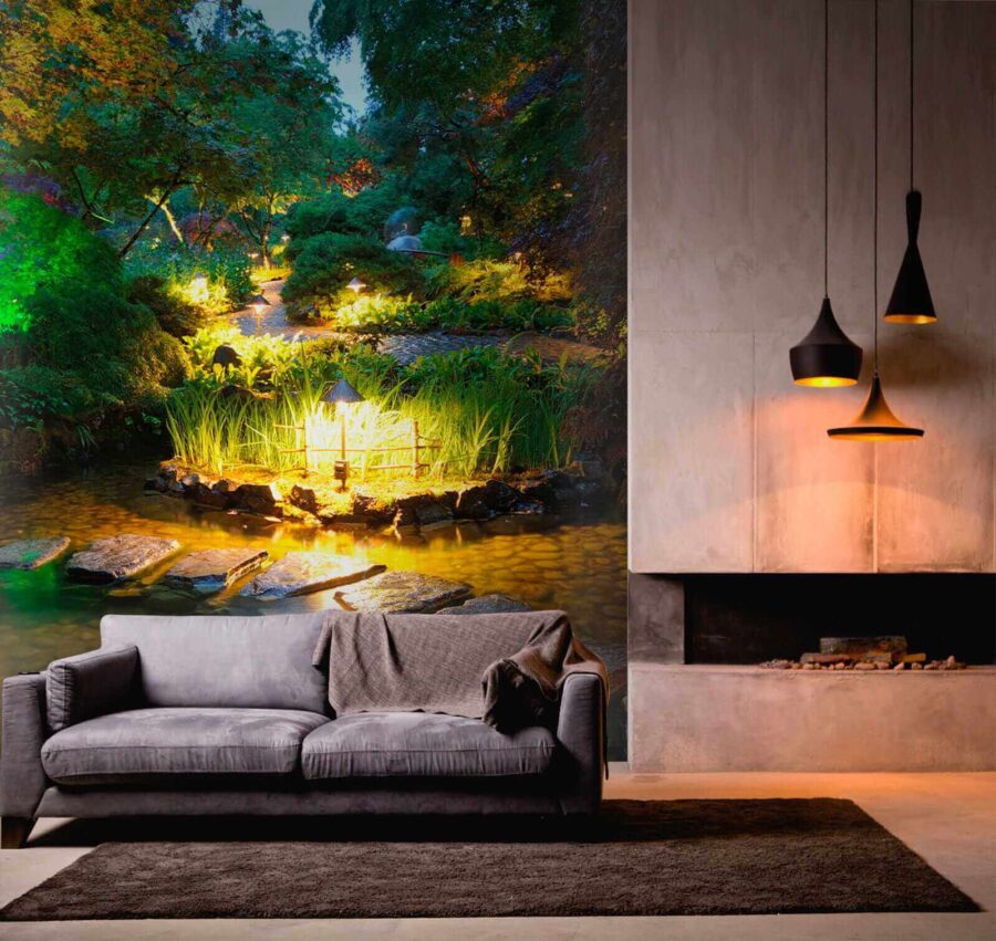 Transformeer elke ruimte met de betoverende “Muurschildering Stenen pad in een vijver met lichtjes”. Stel je voor dat je vanuit je woonkamer een rustige ontsnapping binnenstapt! Deze muurschildering omhult je met rustgevende tinten en zacht glinsterende lichtjes, waardoor het lijkt alsof je in de schemering door een verborgen tuin dwaalt.