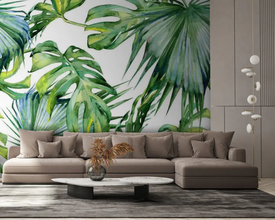 Tover een muur om in een levendige tropische oase met deze aquarelmuurschildering met weelderige bladeren die bijna een zomerbriesje fluisteren. Stel je voor dat je een ruimte binnenstapt die levendig aanvoelt, waar het levendige groen danst met het zonlicht en tegelijkertijd een sfeer van rust en avontuur creëert. Het is alsof je een stukje natuur in huis haalt, zonder dat je water hoeft te geven. Deze muurschildering is ideaal voor een gezellig leeshoekje of een levendige eethoek en nodigt uit tot een gesprek, misschien zelfs tot dagdromen over strandvakanties of luie hangmatmiddagen. Wie zou dat niet willen? Met elke blik geeft de kunst een gevoel van ontspanning, waardoor elke kamer fris en uitnodigend aanvoelt. Perfect voor iedereen die een vleugje vreugde aan zijn inrichting wil toevoegen.