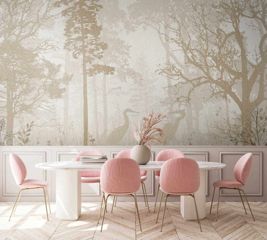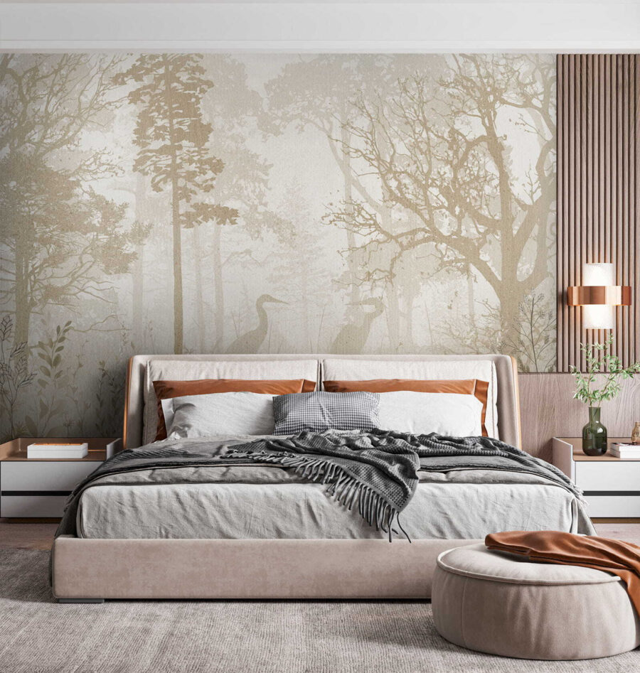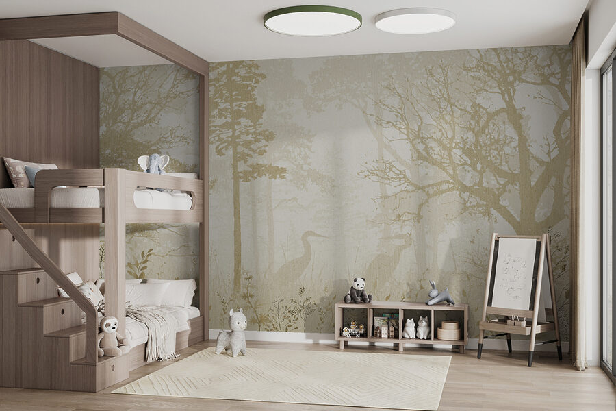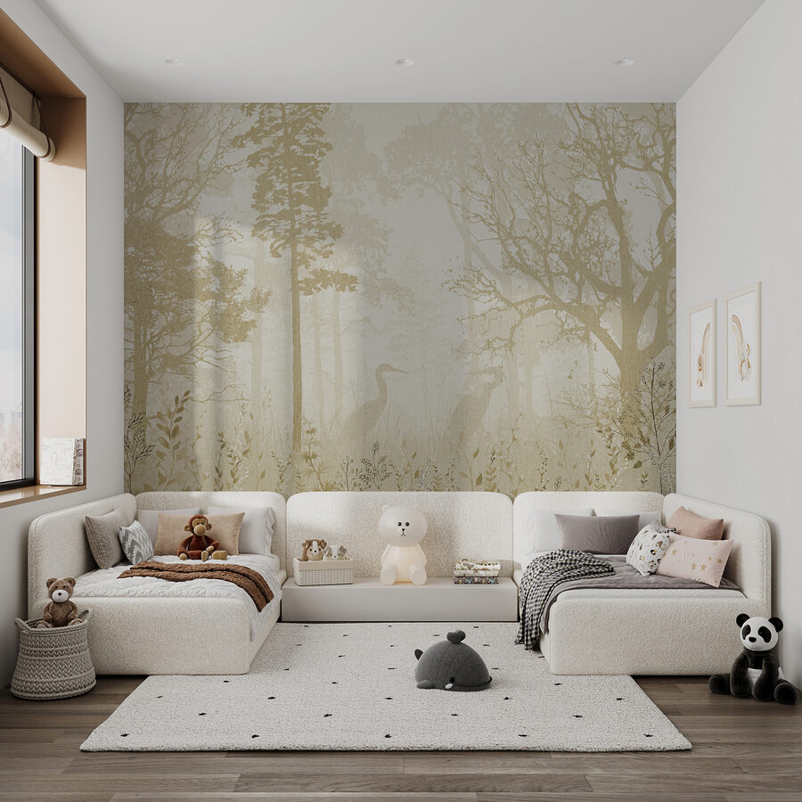 Stel je een serene ochtend voor waar reigers vredig door een mistig bos wandelen. Deze muurschildering voelt aan als een zacht gefluister van de natuur – perfect om een vleugje rust in elke kamer te brengen. Het is stemmig en mysterieus, maar toch verfrissend schilderachtig, waardoor het een opvallende verschijning is in elk interieur. Kinderen zijn dol op de verhalenboekachtige sfeer, terwijl volwassenen de aquarel elegantie waarderen. Stel je dit prachtige, bosrijke tafereel voor in een kinderkamer of een gezellige leeshoek – het is als een frisse wind als de wereld te lawaaierig wordt.
