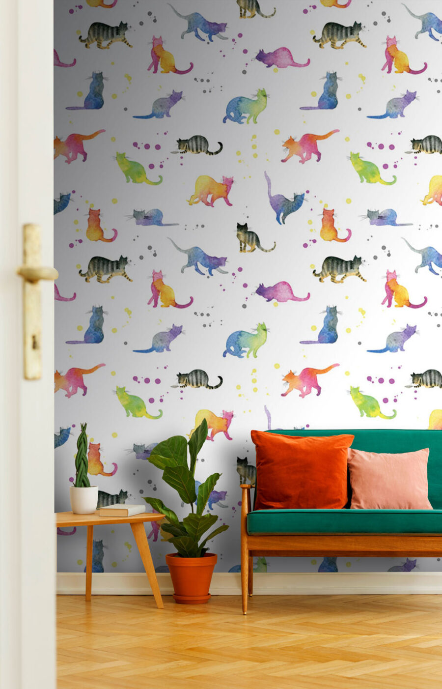 Verander elke muur in een speelse jungle van aquarelkatten die zelfs de meest chagrijnige kat laten spinnen! Deze muurschildering barst van de kleur en katachtigheid, met een combinatie van speelse snorharen en flirterige staarten. Stel je voor dat je een kamer binnenloopt waar elke blik een nieuwe katachtige vriend onthult, klaar om je dag op te fleuren. De mix van zachte tinten roept een gevoel van rust op, perfect voor een gezellig leeshoekje of een eigenzinnige kinderkamer. Het is alsof je elke dag met katjes knuffelt, maar dan zonder de kattenbak! Of je nu een kattenliefhebber bent of gewoon van leuke decoraties houdt, deze muurschildering zal iedereen die langskomt zeker bekoren.
