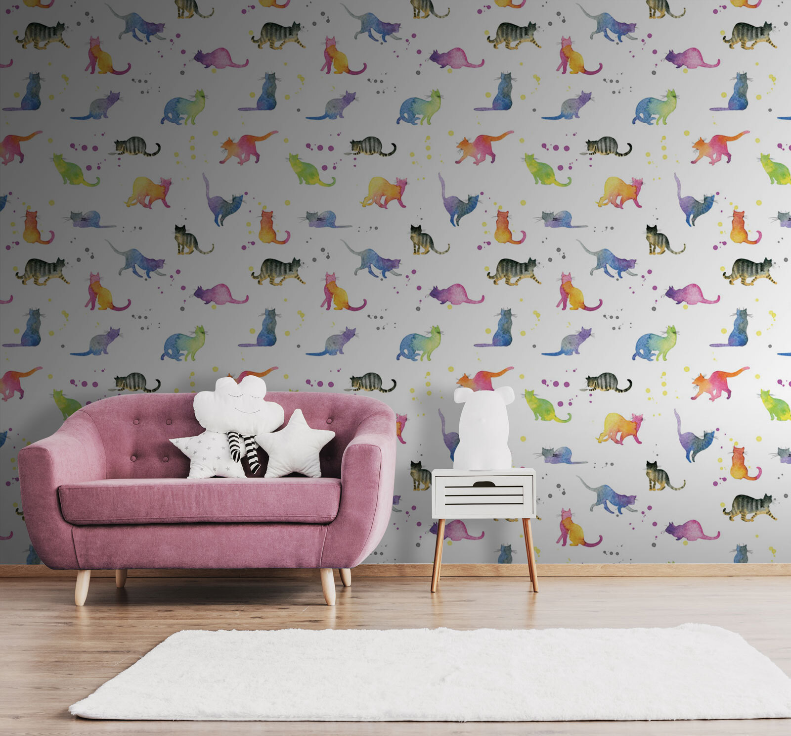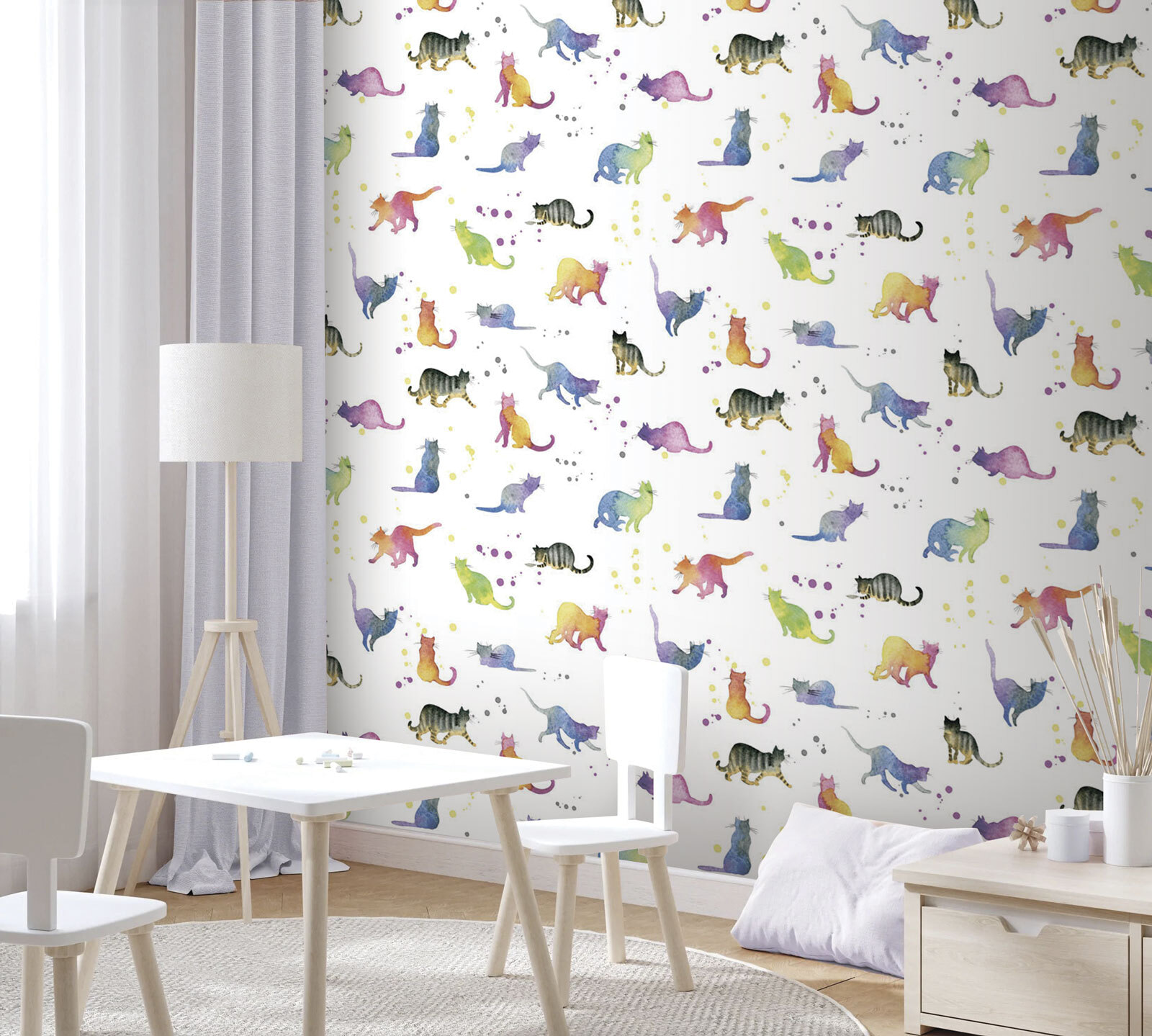 Verander elke muur in een speelse jungle van aquarelkatten die zelfs de meest chagrijnige kat laten spinnen! Deze muurschildering barst van de kleur en katachtigheid, met een combinatie van speelse snorharen en flirterige staarten. Stel je voor dat je een kamer binnenloopt waar elke blik een nieuwe katachtige vriend onthult, klaar om je dag op te fleuren. De mix van zachte tinten roept een gevoel van rust op, perfect voor een gezellig leeshoekje of een eigenzinnige kinderkamer. Het is alsof je elke dag met katjes knuffelt, maar dan zonder de kattenbak! Of je nu een kattenliefhebber bent of gewoon van leuke decoraties houdt, deze muurschildering zal iedereen die langskomt zeker bekoren.