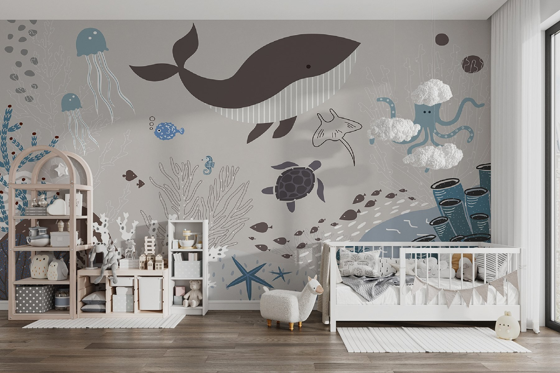 Stel je de blik van opwinding op het gezicht van je kleintje voor als ze in slaap vallen omringd door vriendelijke zeedieren. Het is niet alleen decoratie, het is een avontuur, elke dag weer. Of je nu een kinderkamer wilt opknappen of de speelkamer wat meer pit wilt geven, deze muurschildering is precies wat je nodig hebt. Schattig, rustgevend en supercool – wat is er niet leuk aan?