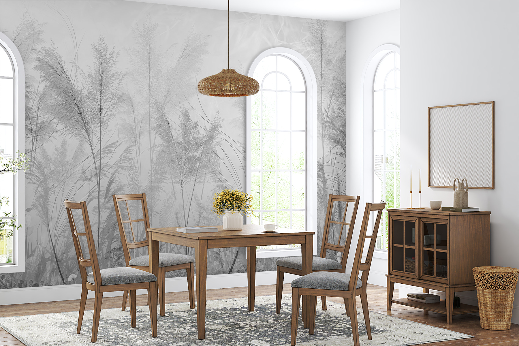 Stel je dit eens voor: Je loopt je ruimte binnen en opeens zie je hoog gras zachtjes wiegen in een mistig landschap op je muur. Deze muurschildering voelt alsof je een droom binnenstapt, waar de ochtenddauw nog op het canvas van de natuur kleeft. Het is perfect voor iedereen die een stukje van het rustige landschap binnenshuis wil halen. Stel je voor dat je je favoriete boek leest of van een hete thee nipt met deze serene achtergrond; het is als een frisse wind, zonder de insectenbeten. Dit ontwerp past moeiteloos in een moderne inrichting en voegt een vleugje eigenzinnigheid en rust toe. Ideaal voor die winteravonden waarop je hunkert naar een vleugje natuur met een kunstzinnige twist. Deze muurschildering voldoet aan alle eisen!