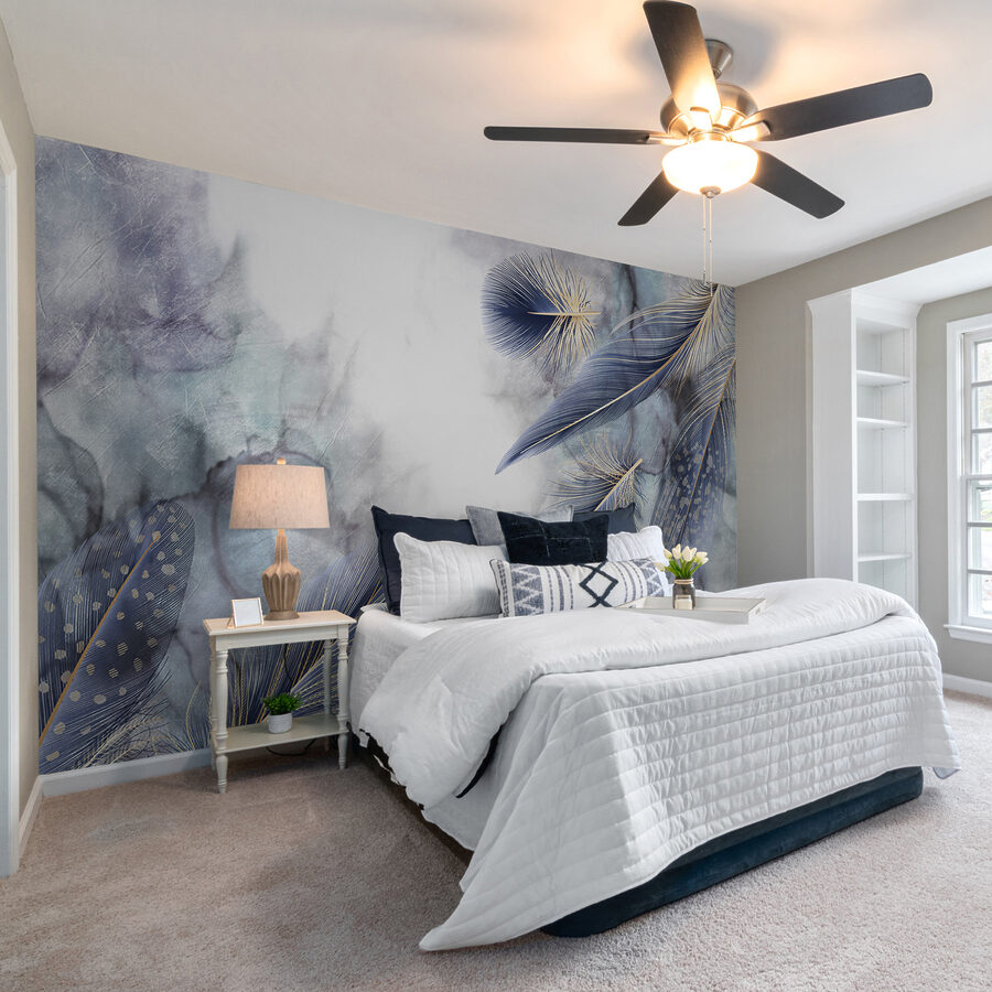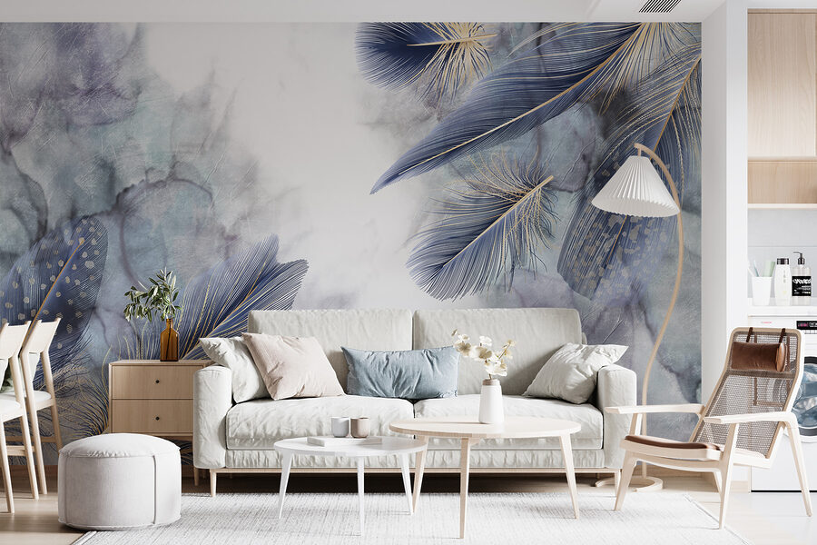 De veerontwerpen dansen sierlijk over de muur – sommige gedurfd en andere verlegen, elk met een eigen verhaal. Zie deze muurschildering al voor je in een gezellig leeshoekje of boven een stijlvolle bank, waar ze aanzet tot gesprekken en bewondering. Het is niet zomaar behang; het is een welkome knuffel voor je muren. Vrienden zullen binnenkomen, even stilstaan en zeggen: “Wow, waar heb je dit gevonden?”. Een echte gespreksstarter. Of het nu de zachte blauwtinten zijn of het luchtige gevoel dat in het oog springt, het voegt een vleugje eigenzinnigheid en verfijning toe. Perfect voor wie houdt van een unieke inrichting zonder overdreven te zijn – een knipoog naar de natuur die elke kamer een thuisgevoel geeft.