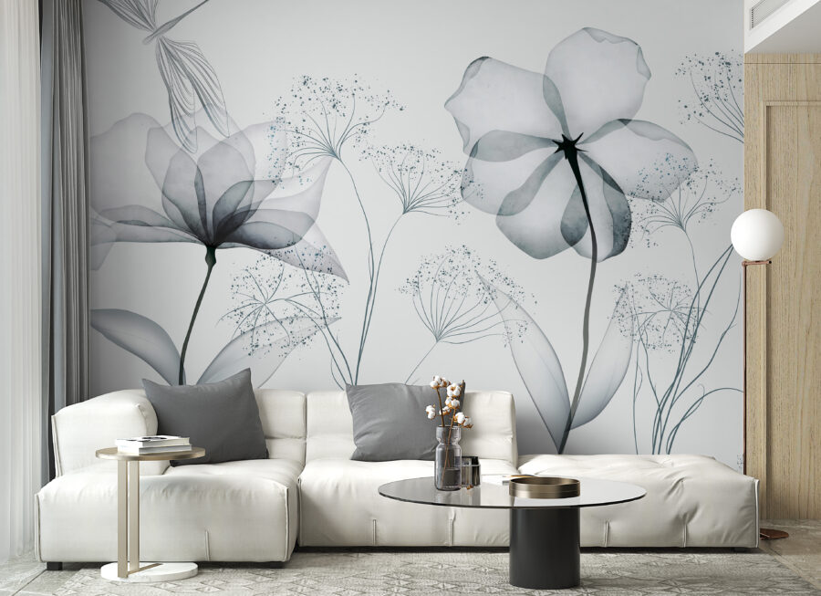 Stel je voor dat je een kamer binnenloopt en begroet wordt door de eenvoudige schoonheid van delicate, monochrome bloemen. Deze muurschildering is niet alleen decor – het is een stemming. Elke bloem, zacht geborsteld in zachte grijstinten, doet denken aan rustige ochtenden en vredige middagen. Perfect voor wie houdt van een minimalistisch tintje maar toch hunkert naar een vleugje natuur. Het is alsof je een aquareltuin in je woonkamer hebt, zonder het water geven! Of je nu zit te dagdromen in je favoriete stoel of vrienden ontvangt, deze muurschildering zorgt ervoor dat alles een beetje serener aanvoelt. Een stukje rust aan je muur. Wie zou daar niet van houden?