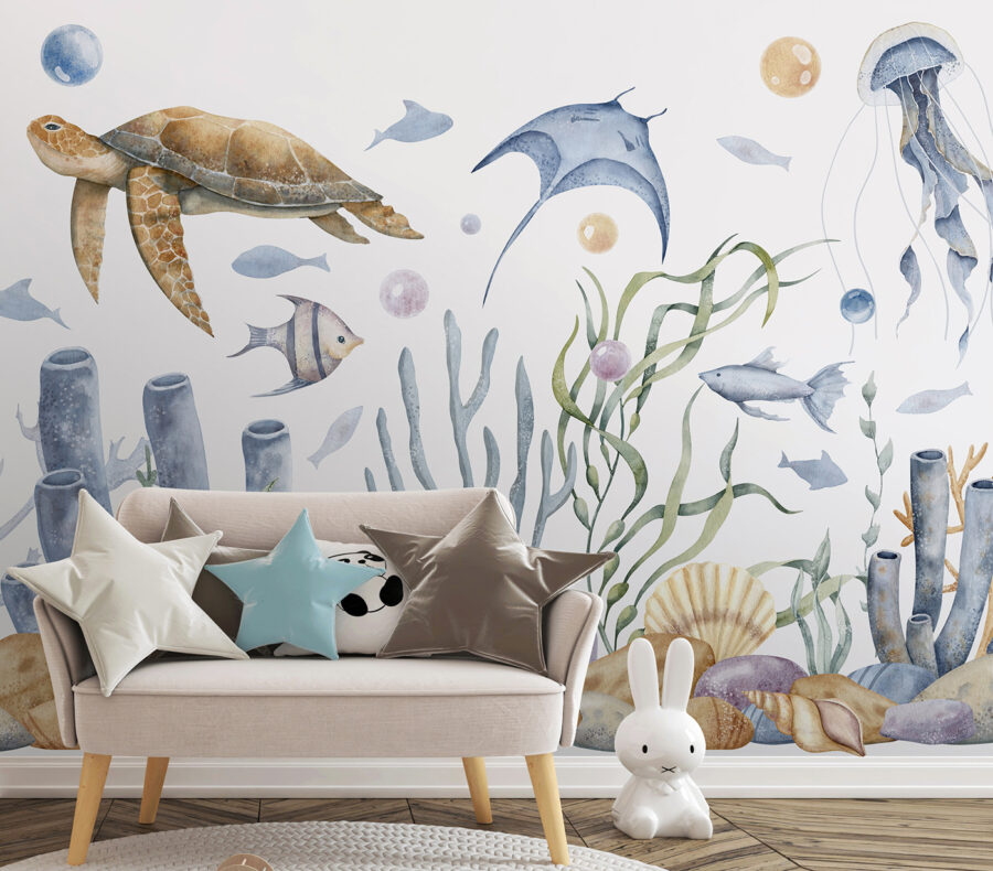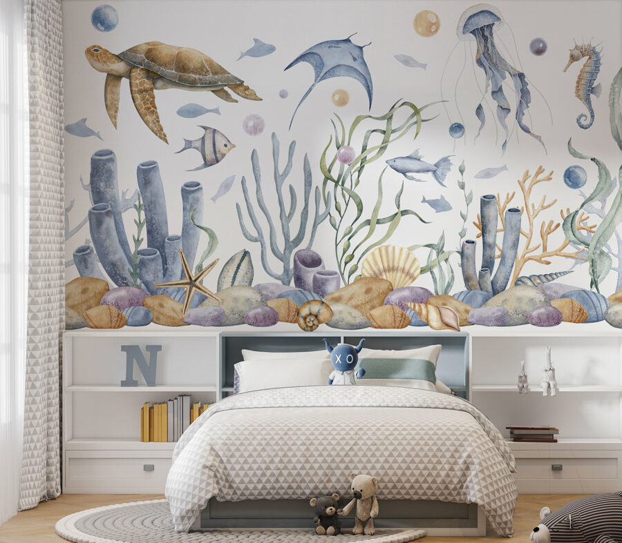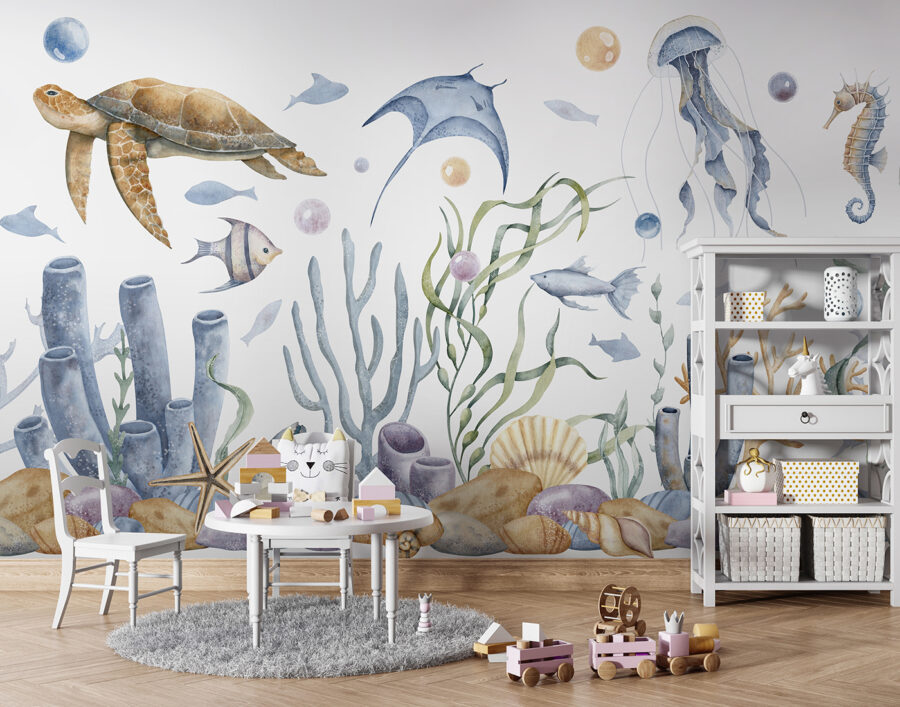 Stel je eens voor hoe het gezicht van je kind oplicht als hij zijn kamer ziet veranderen in een magische onderwaterwereld. Deze muurschildering heeft het allemaal – speelse zeeschildpadden die voorbij glijden, mysterieuze kwallen die ronddrijven en nieuwsgierige zeepaardjes die uit het zeewier gluren. De aquarelstijl voegt een dromerig tintje toe, als een rustgevend slaapliedje voor de ogen. Het is perfect voor kinderkamers, of je nu kleine ontdekkingsreizigers of kleine visliefhebbers hebt. Stel je voor dat bedtijd verandert in een heerlijk verhaal over wateravonturen, waar schelpen geheimen fluisteren en vissen verstoppertje spelen. Bovendien is het niet alleen voor de kinderen – een vleugje rust voor de kinderkamer of een charmante achtergrond voor je leeshoek. Duik er dus in en laat deze muurschildering een golf van eigenzinnigheid en rust in je interieur brengen.
