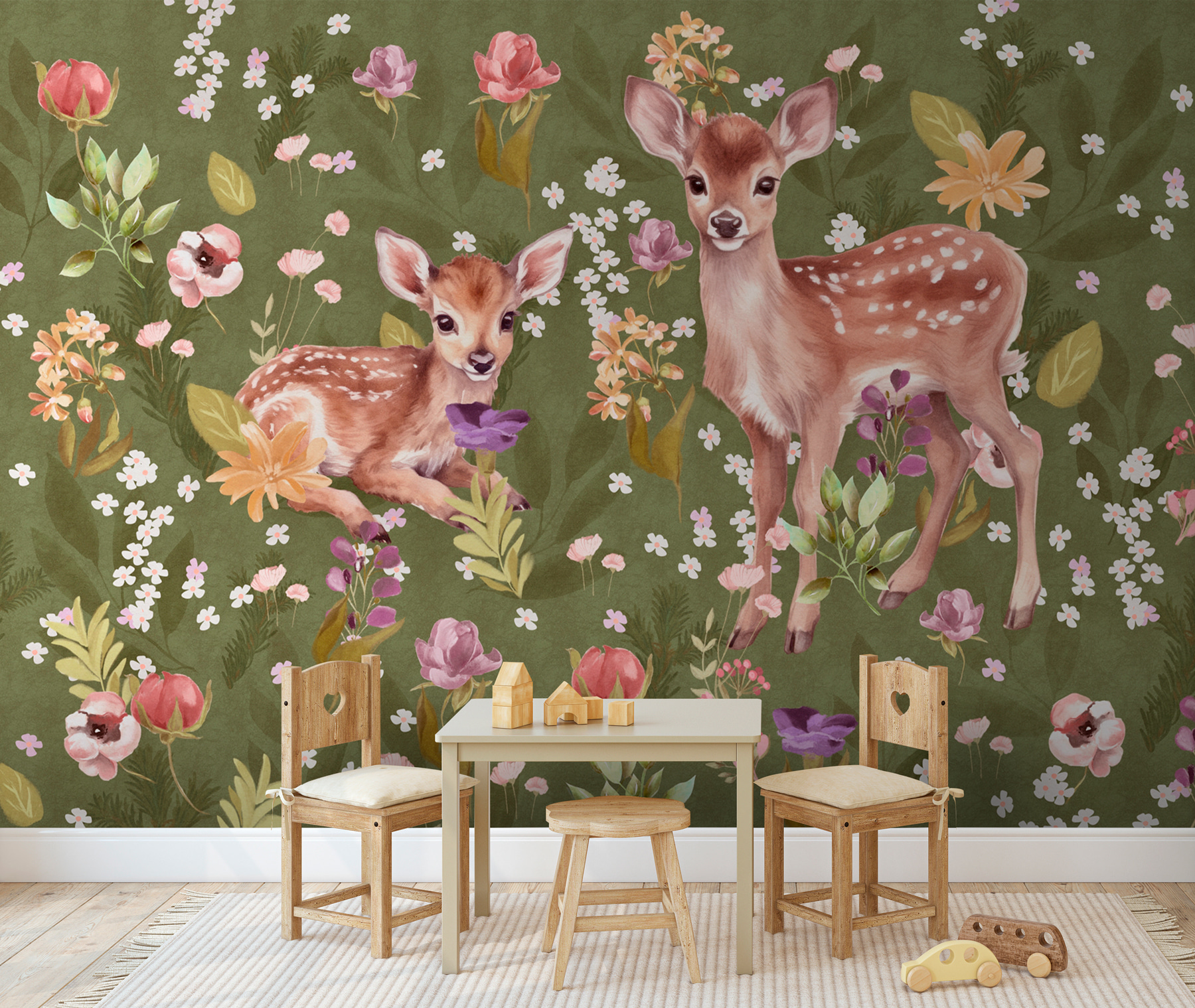 Tover elke kamer om in een grillig oase met deze prachtige muurschildering met charmante herten die tussen levendige bloemen dansen. Stel je voor dat je je ontspant in een ruimte waar de natuur tot leven komt op je muren. De zachte kleuren en lieve beestjes creëren een uitnodigende sfeer, perfect om de verbeelding van kinderen aan te wakkeren of om volwassenen een rustig toevluchtsoord te bieden. Het is alsof je een stukje betoverd bos in huis haalt. Of het nu een kinderkamer, speelkamer of gewoon een gezellig hoekje is, deze muurschildering zal zeker harten verwarmen en een glimlach op je gezicht toveren. Het is als een klein venster naar de natuur, alleen zonder de insecten!