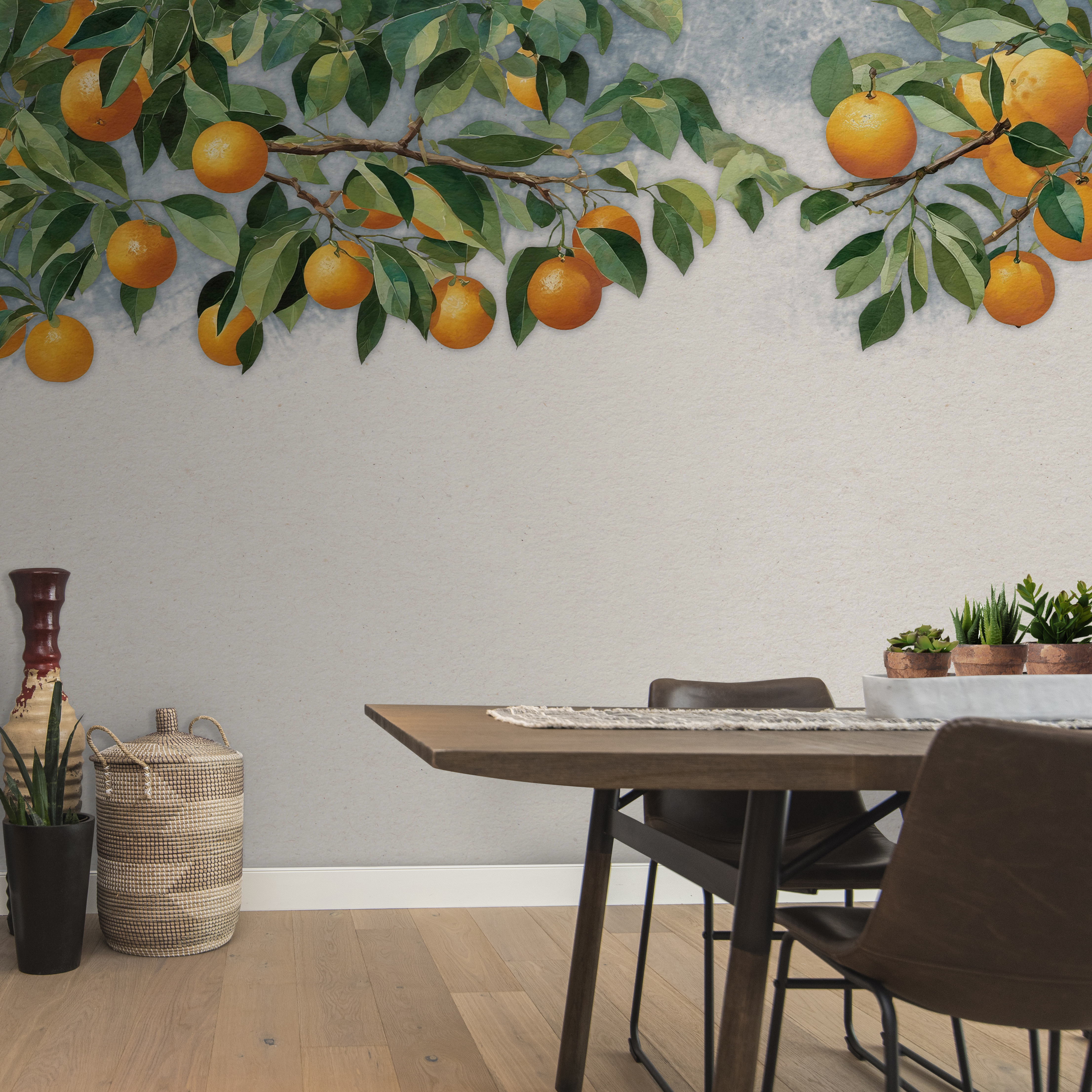Fleur elke kamer op met deze charmante muurschildering met vrolijke sinaasappels die aan weelderige takken bungelen. Het is alsof je een zonnige boomgaard binnenstapt zonder je huis te verlaten. Stel je voor dat je ‘s ochtends aan je koffie nipt voor dit levendige landschap en de goede vibraties voelt binnenstromen. Perfect voor een keuken of een gezellig hoekje, het voegt moeiteloos een vleugje kleur en warmte toe. De waterige tinten geven het een dromerig tintje, waardoor elke muur levendig aanvoelt. Wie heeft er vakantie nodig als je een stukje natuur naar binnen kunt halen? Bovendien past het bij elke interieurstijl – over veelzijdigheid gesproken!