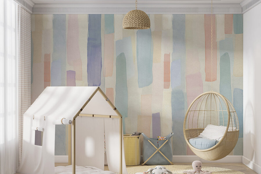 Stel je dit eens voor: je loopt je woonkamer binnen en in plaats van saaie oude verf, word je begroet met droomachtige pastelkleurige aquarelstrepen. Het is alsof iemand een zachte, mistige ochtend heeft genomen en die op je muur heeft gespat. Over een instant moodboost gesproken! Het is levendig en toch rustig, alsof je een fluisterend briesje in huis hebt. De kleuren versmelten zo natuurlijk, waardoor het perfect is voor een gezellige leeshoek of zelfs je creatieve werkplek. Deze muurschildering heeft die moeiteloze elegantie en een vleugje eigenzinnigheid. Het is een lust voor het oog en straalt die zoete, relaxte sfeer uit waar we allemaal naar hunkeren. Perfect om elke ruimte om te toveren in jouw persoonlijke pastelparadijs!