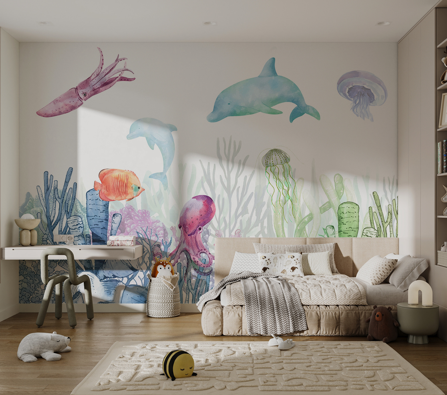 Altijd al de magie van de onderwaterwereld in huis willen halen? Bekijk deze charmante aquarelmuurschildering met een inktvis en zijn watervriendjes! Perfect voor kinderkamers, of het nu de kinderkamer van je kleintje is of de chillruimte van je tiener. De dromerige sfeer aan zee geeft iedereen het gevoel dat ze in een avontuur duiken telkens als ze de kamer binnenstappen.