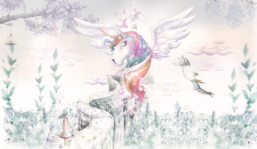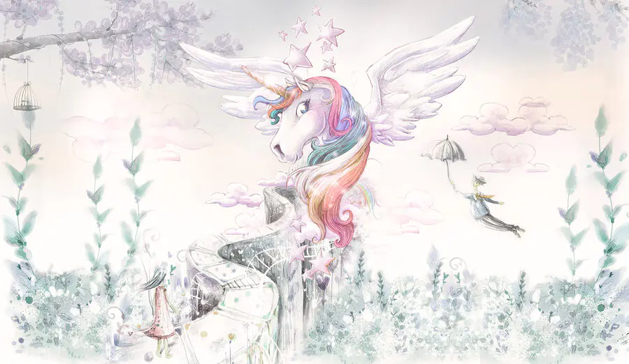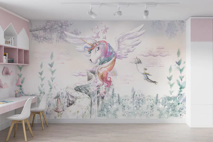 Op zoek naar een vleugje magie in de kamer van je kind? Kijk dan eens naar deze muurschildering “Eenhoorn met vleugels en regenbooghaar”! Stel je voor dat je wakker wordt met een tafereel rechtstreeks uit een sprookje – een grillige eenhoorn met vloeiend pastelkleurig regenbooghaar, omringd door zachte wolken en fonkelende sterren. Het is als de droom van elk kind, geschilderd op hun muur! Deze muurschildering past prachtig in kinderkamers en kamers van jonge kinderen, waardoor het voelt alsof ze in hun favoriete verhalenboek zijn beland. Zoetsappig, maar toch betoverend – het geeft vreugde en eindeloze verhalen. Perfect voor het wonderland van een kleintje of het toevluchtsoord voor eenhoornliefhebbers! 🌈🦄
