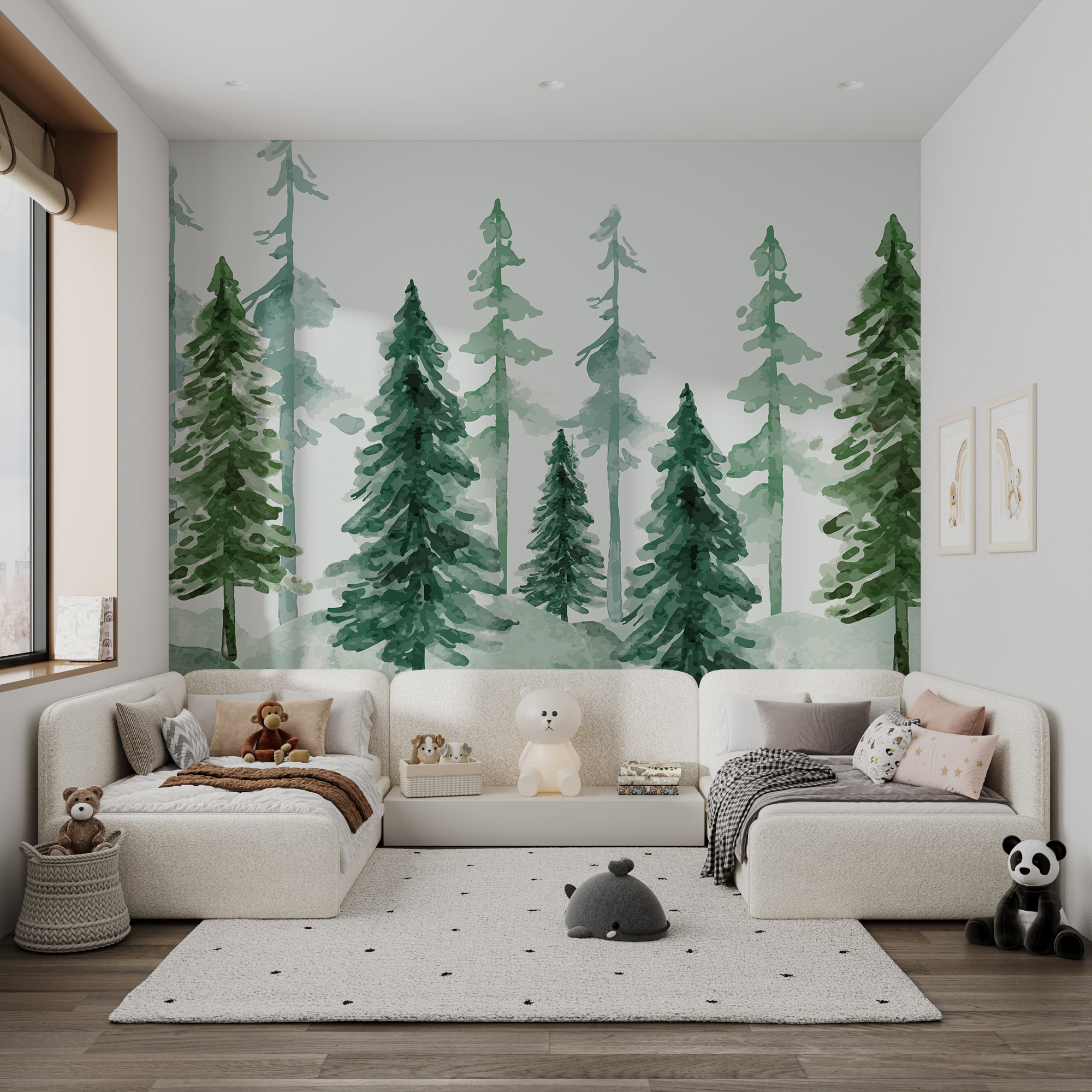 Stel je voor dat je een rustig bos binnenstapt zonder je woonkamer te verlaten. Deze muurschildering “Groenblijvend bos in aquareltinten” brengt een frisse wind in je interieur. De zachte groentinten en delicate aquarellen geven het gevoel alsof de bomen zachtjes voor je ogen wiegen. Het is perfect voor het creëren van een serene, op de natuur geïnspireerde oase in elke kamer. Ik bedoel, stel je voor dat je je met een boek onder het bladerdak nestelt of een glimp opvangt van dit bosgezicht tijdens je ochtendkoffie. Het is net een kleine ontsnapping aan de drukte, direct aan je muur. Bovendien zijn de bosachtige effecten heel rustgevend en geven ze elk huis een aards, bijna magisch tintje. Wees niet verbaasd als je begint te dromen van bosavonturen of geïnspireerd raakt om wat meer natuur in je leven te brengen!