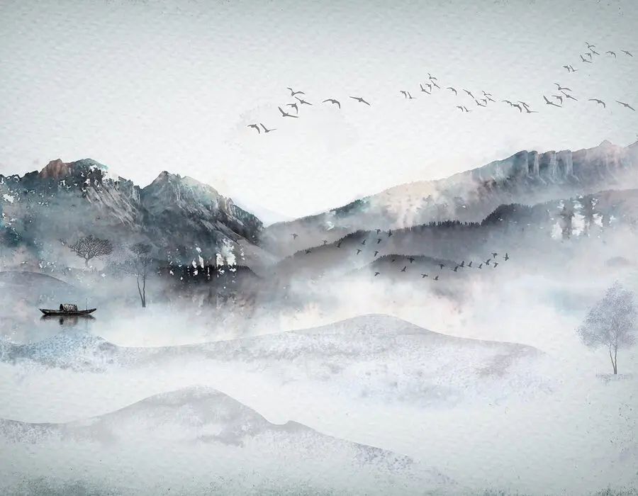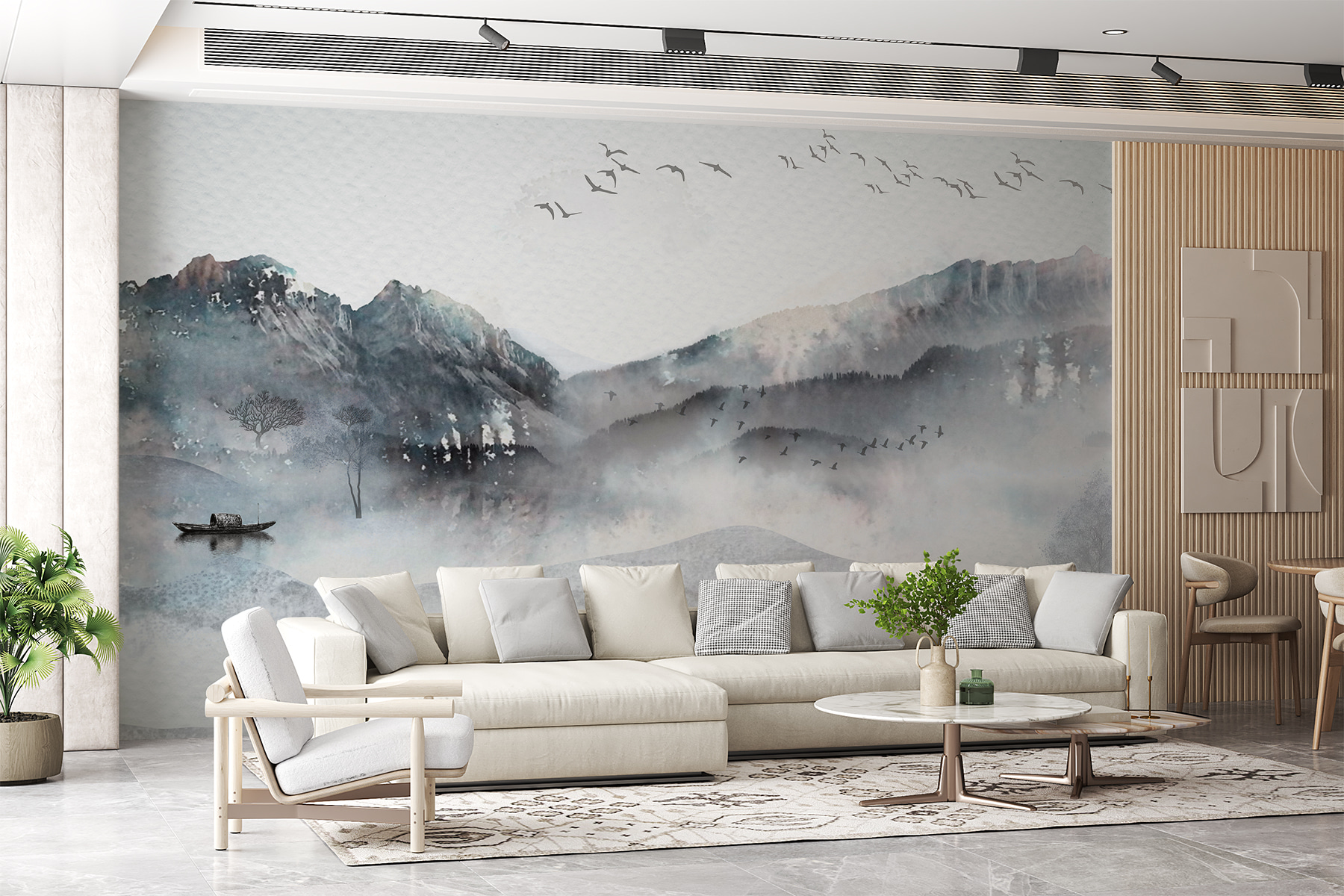 Stel je voor dat je een kamer binnenstapt en begroet wordt door een serene groep vogels die door een dromerige lucht zweven, hoog boven een mistig boslandschap. Deze aquarelmuurschildering is niet zomaar kunst, het is een ervaring. De kalmerende mist, zachte heuvels en bergen in de verte lijken op een zacht gefluister van de natuur. Het is bijna alsof je het gefluister van de bomen kunt horen en de koele, frisse ochtendlucht tegen je huid kunt voelen strijken.