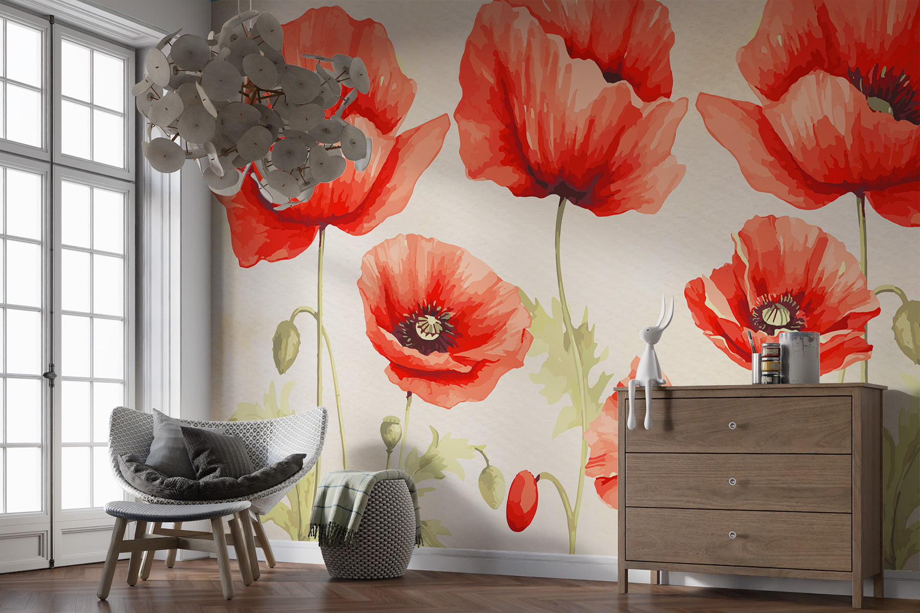 Fleur elke kamer op met deze betoverende muurschildering met rode klaprozen in een mooie aquarelstijl. Stel je voor dat je in een zonovergoten weide stapt telkens als je je kamer binnenloopt; deze levendige bloemen fluisteren bijna zoete woordjes naar je zintuigen. Het zachte, organische gevoel van het kunstwerk voegt warmte en charme toe, waardoor het perfect is voor gezellige hoekjes of levendige woonkamers. Het is alsof je een stukje natuur in huis haalt, zonder de vervelende pollen! Hang het op en kijk hoe het de sfeer verandert, vreugde opwekt en misschien zelfs een beetje dagdroomt.