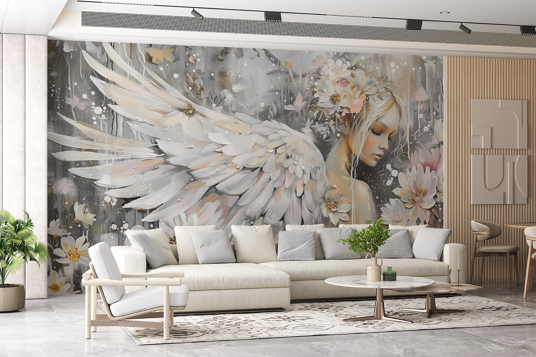 Transformeer elke ruimte met deze betoverende muurschildering met een vrouw met prachtige vleugels omringd door delicate bloemen. Stel je voor dat je een kamer binnenloopt en het gevoel hebt dat je in een grillige dagdroom stapt. Het is alsof natuur en fantasie op de mooiste manier samenkomen.