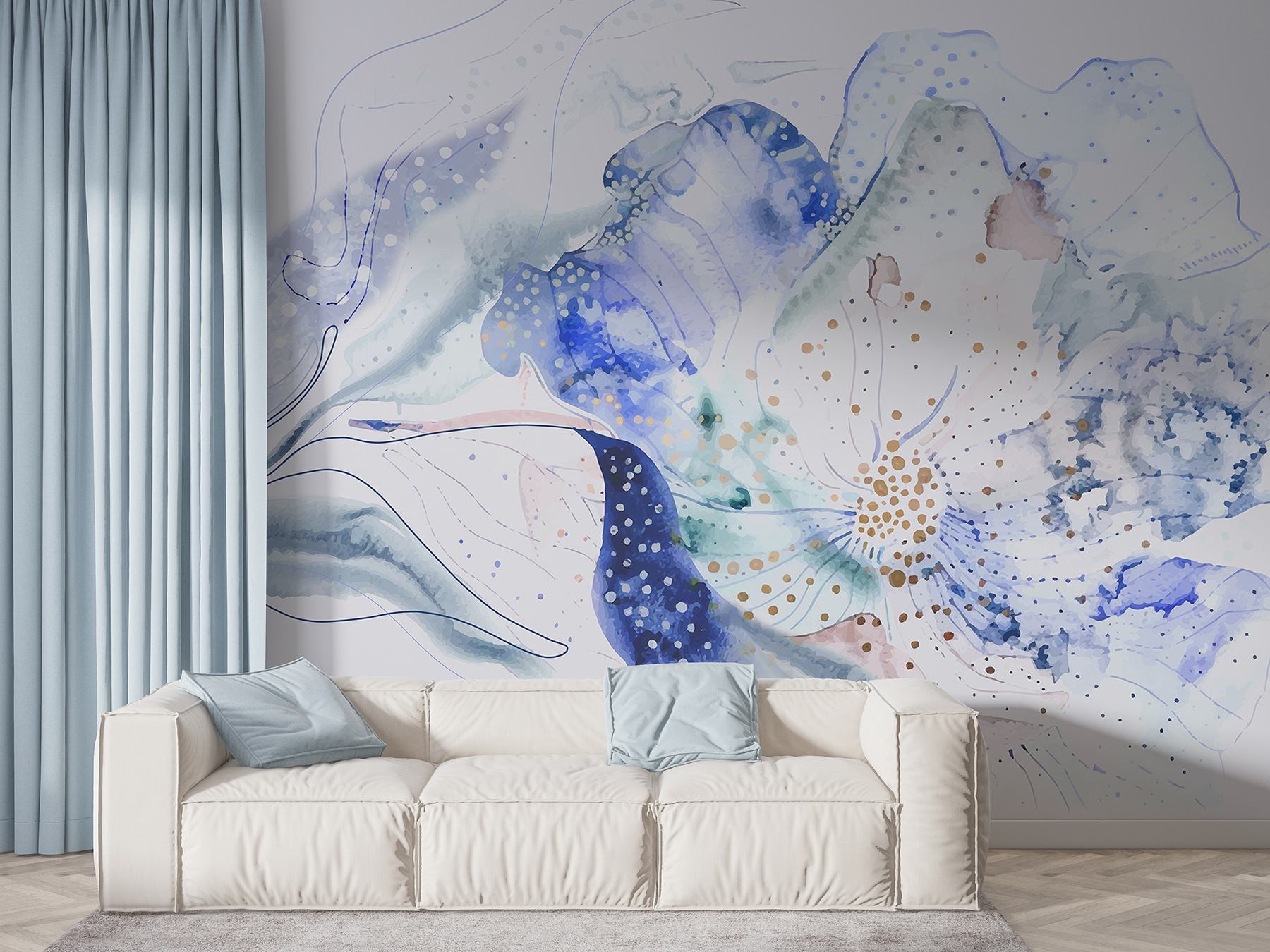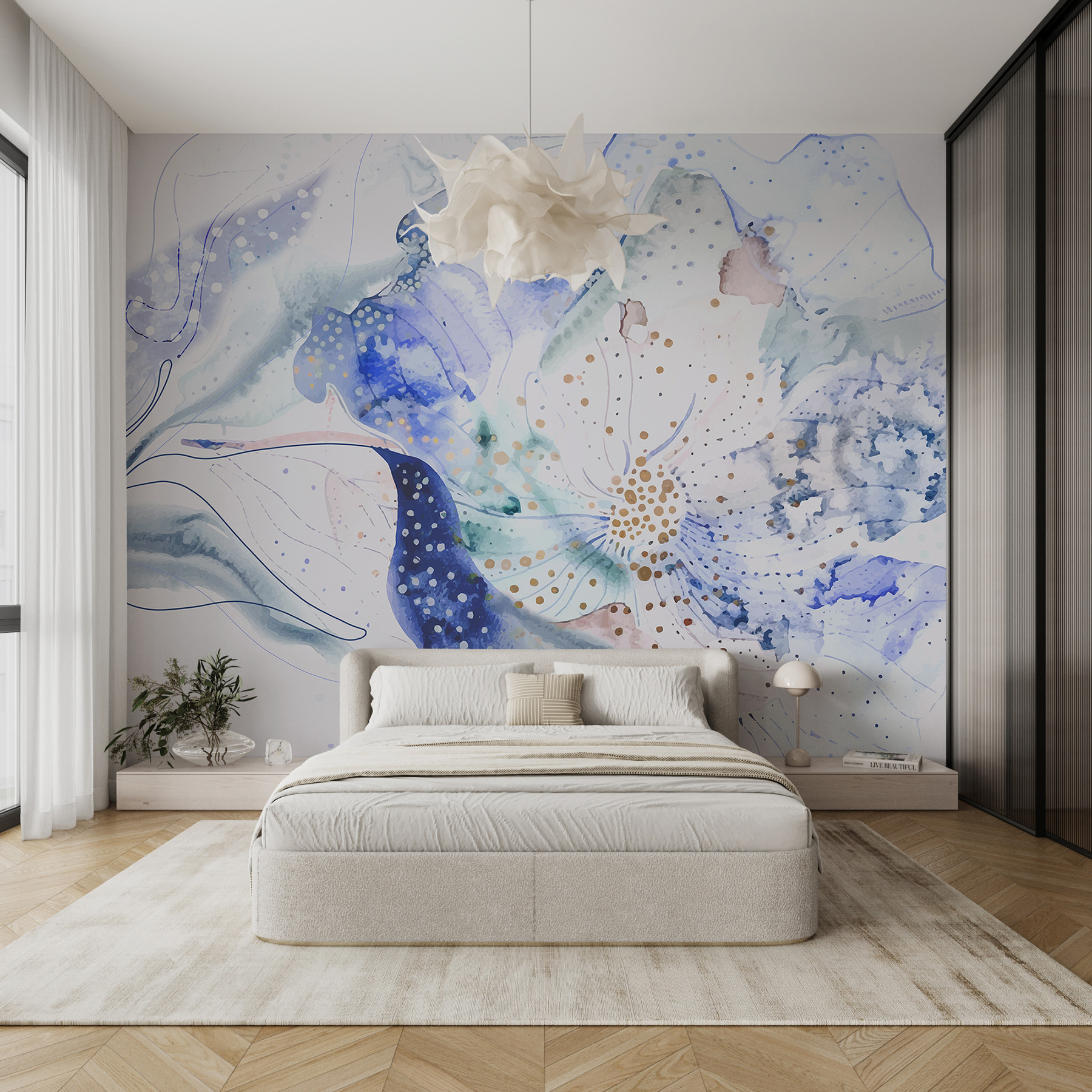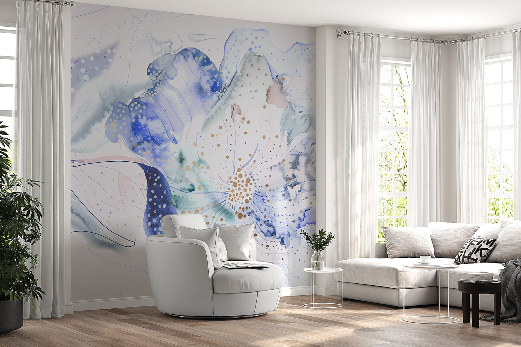 Transformeer elke ruimte met deze prachtige muurschildering die aanvoelt alsof je een serene tuin binnenstapt die barst van de delicate bloesems. De zachte aquareltinten van blauw brengen een kalme sereniteit die perfect is om een kamer op te fleuren of een gezellig hoekje te creëren. Stel je voor dat je lekker wegkruipt met een goed boek en de zachte bloemenvibes je omringen als een warme knuffel. Het is alsof je frisse lucht in huis haalt, zonder de allergieën. De zachte wervelingen en speelse stippen van deze muurschildering dansen over de muur en nodigen uit tot verwondering en reflectie. Een beetje natuur – wie zou daar niet van houden?