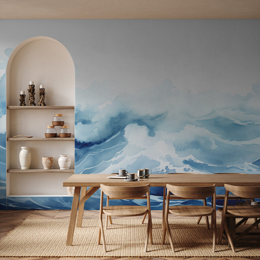 Transformeer je ruimte met de schoonheid van deze aquarelmuurschildering met golven en wolken. Stel je voor dat je in een serene sfeer stapt waar de drukte verdwijnt en alleen jij en het zachte ritme van de oceaan overblijven. Het zachte blauw en wit roept een vredige sfeer op, perfect om een knus hoekje te creëren om te lezen of gewoon te dagdromen onder het genot van je favoriete drankje. Het is alsof je een stukje van de zee in huis haalt – je hebt geen zanderige tenen nodig! Perfect in een woonkamer, slaapkamer of zelfs een creatief hoekje. Bereid je voor op complimenten en mogelijk een beetje afgunst van vrienden!