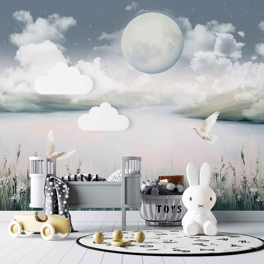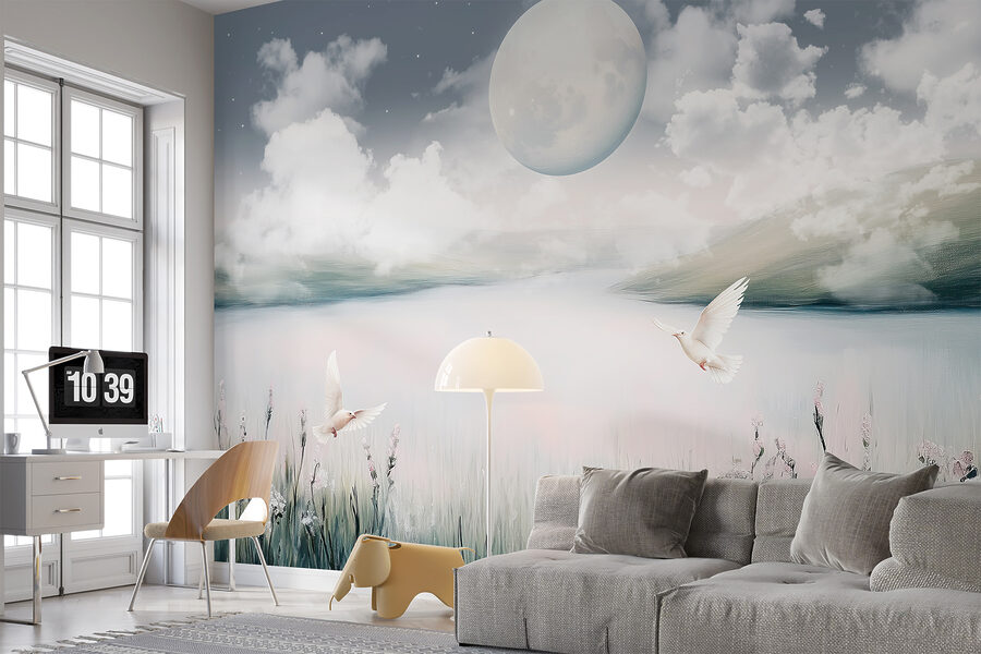 Stel je voor dat je ontspant op de bank met een kopje thee in de hand en het gevoel hebt dat je zweeft in dit serene landschap. De ochtenden voelen vredig aan, de avonden absoluut magisch. Het is perfect voor iedereen die van de natuur houdt en een vleugje van het grillige wil. Bonus? De pastelkleurige bloemen en vogels voegen precies de juiste charme toe zonder te overdreven te zijn. Zeker een gespreksstarter bij het volgende familiediner! 🌙✨
