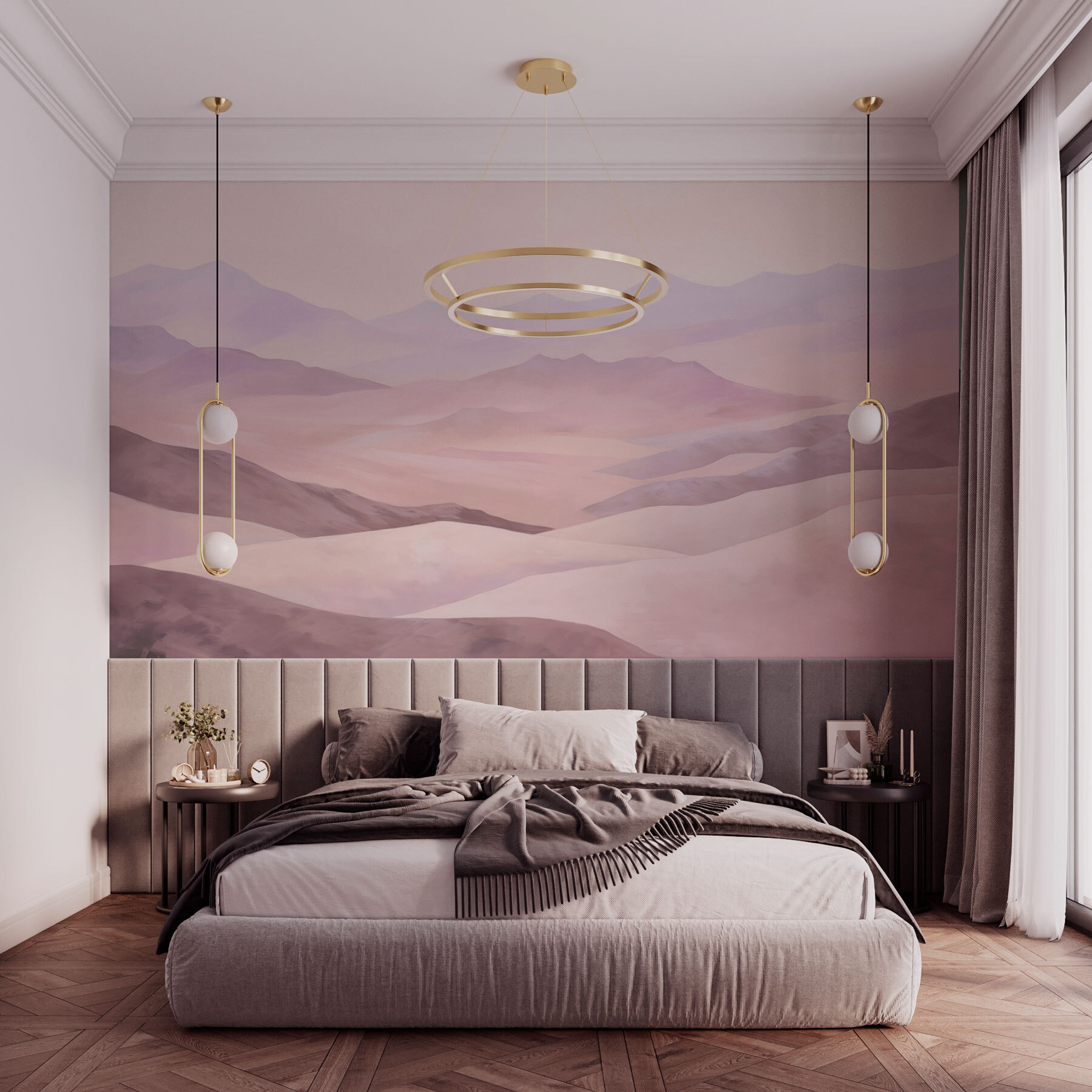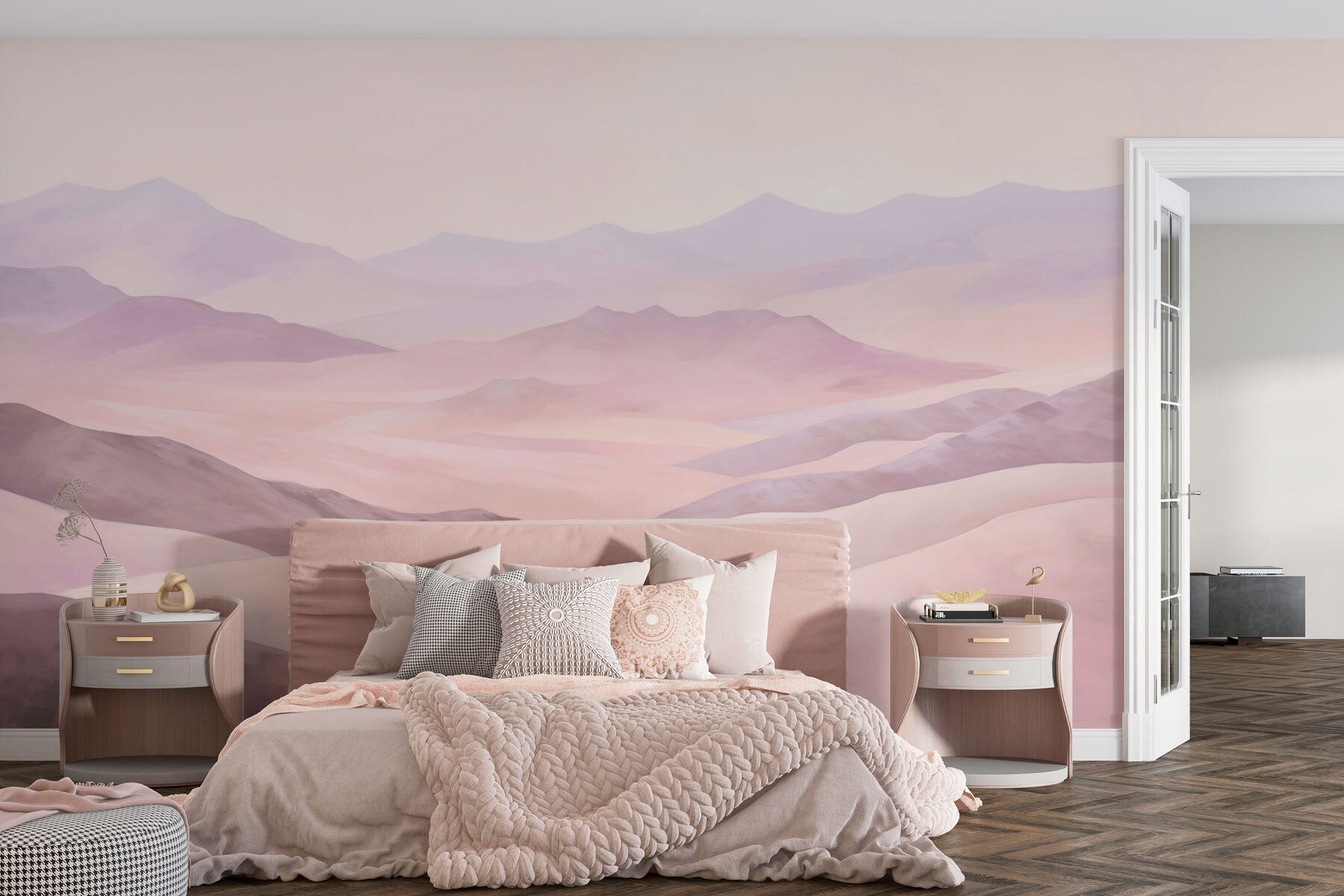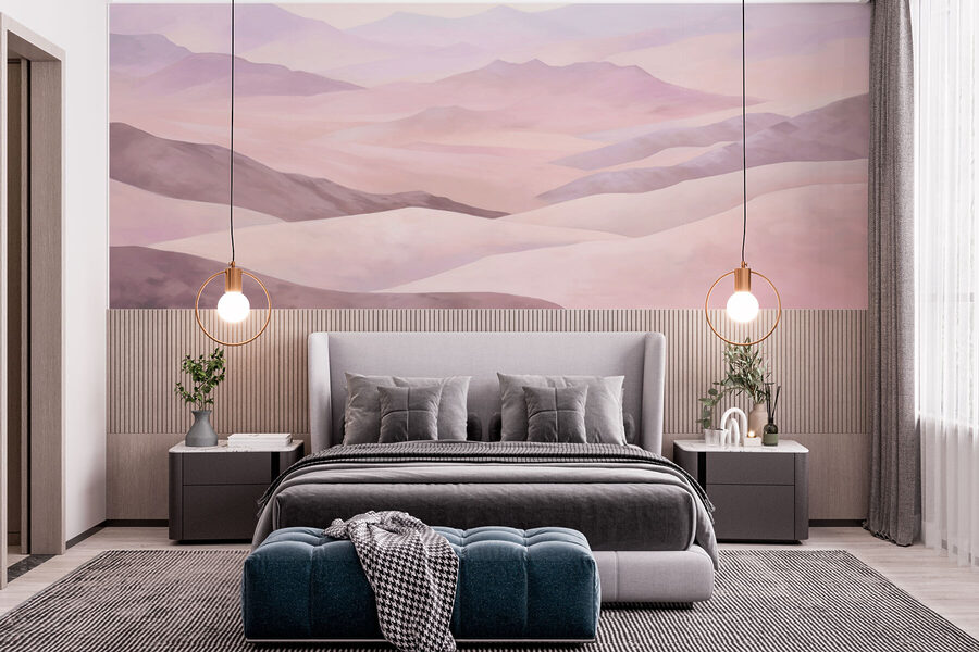 Stel je voor dat je in je favoriete stoel ligt en naar een prachtige aquarelmuurschildering staart die over je muur rolt als een zacht, dromerig landschap. Het is meer dan alleen maar mooie heuvels en stille bergen – het is alsof de natuur besloten heeft om binnen te komen voor een praatje. Perfect voor iedereen die ervan droomt te ontsnappen naar vredige, weidse ruimtes zonder de woonkamer te verlaten. De zachte, gedempte kleuren zorgen voor een rustgevende sfeer en wikkelen je in een knusse, schilderachtige knuffel. Of je nu dagdroomt of een dutje doet, deze muurschildering is er voor jou!
