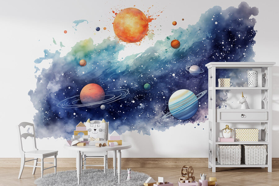 Verander je ruimte in een kosmisch wonderland met deze prachtige muurschildering, “Planets in the Sky with Planets”. Het is alsof je het heelal naar je woonkamer brengt – een raket is niet nodig. Stel je voor dat je achterover leunt, naar die prachtig bewerkte planeten staart en het gevoel hebt dat je tussen de sterren kunt zweven. Het zachte aquarelontwerp voegt een dromerig tintje toe, waardoor elke kamer ruimer en avontuurlijker aanvoelt.