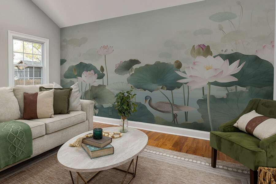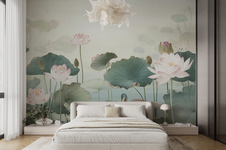 Tover elke ruimte om in een oase van rust met deze betoverende muurschildering van een eend die gracieus door een serene vijver peddelt, versierd met prachtige lotusbloemen. Het zachte aquareleffect geeft een dromerige sfeer, perfect voor een gezellige leeshoek of een rustige slaapkamer. Stel je voor dat je je in de rustgevende kleuren wikkelt terwijl je thee drinkt of dagdroomt over verre oorden. Het is alsof je een vleugje natuur binnenshuis haalt zonder al die vervelende beestjes! Deze muurschildering is niet alleen decor; het is een stukje rust dat een zachte zucht oproept telkens als je er langs loopt.