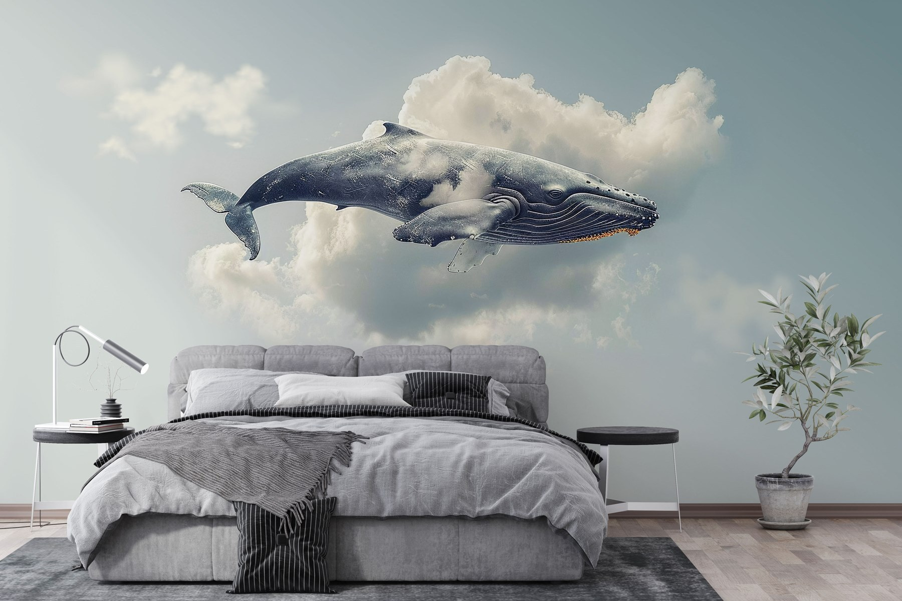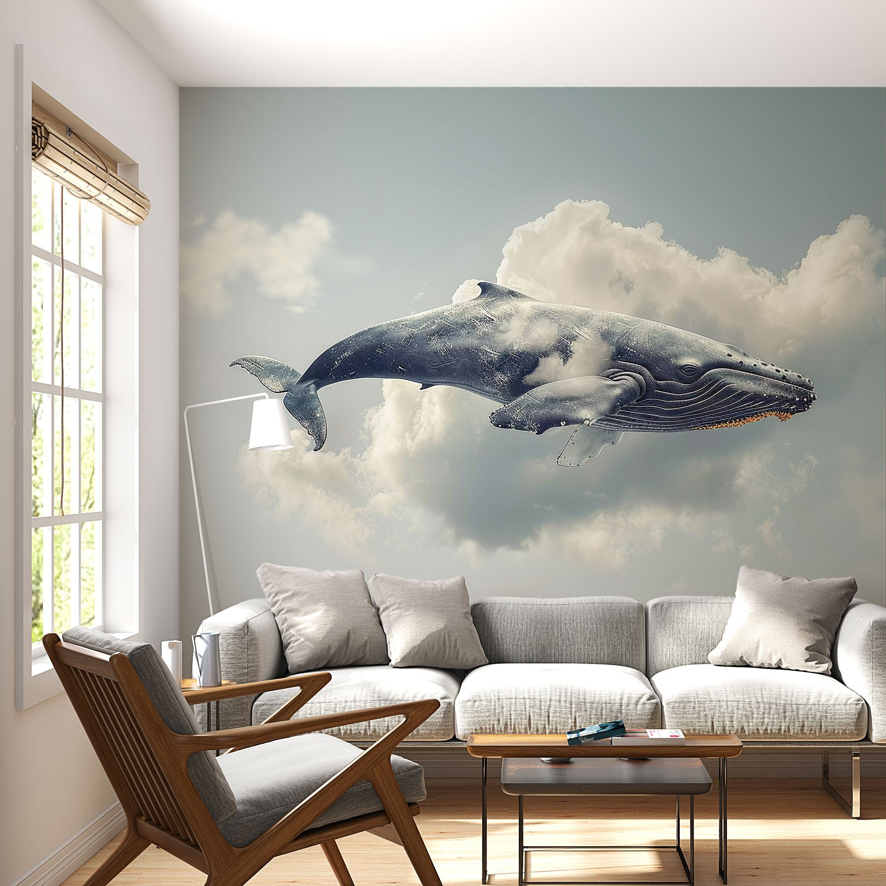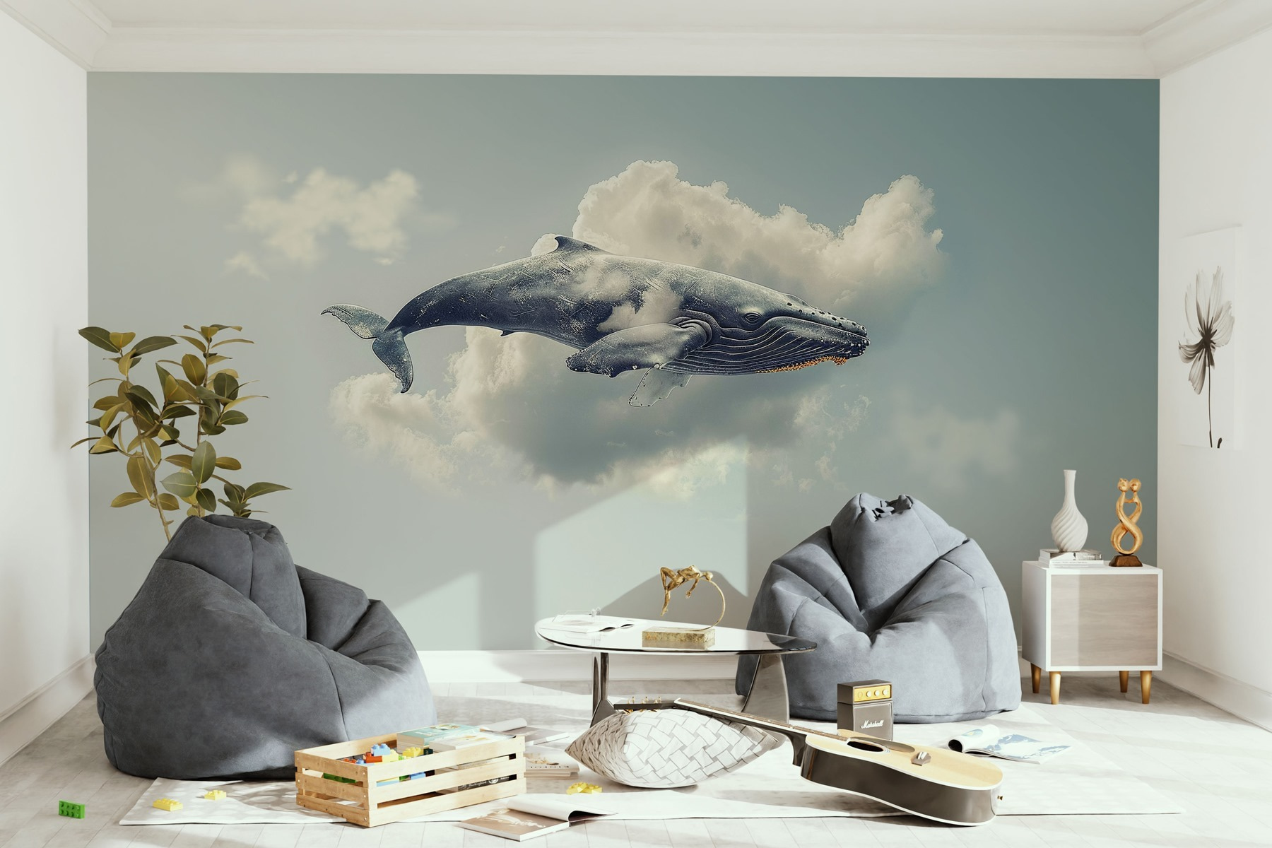 Stel je voor: een reusachtige walvis, niet in de oceaan, maar vredig glijdend door pluizige wolken. Deze muurschildering, “Fotobehang Whale Flying in the Sky”, voegt een grillige draai toe aan elke ruimte. Stel het je voor in een gezellige woonkamer of kinderkamer – het is alsof je een stukje dromerig zeeleven rechtstreeks naar je muur brengt!