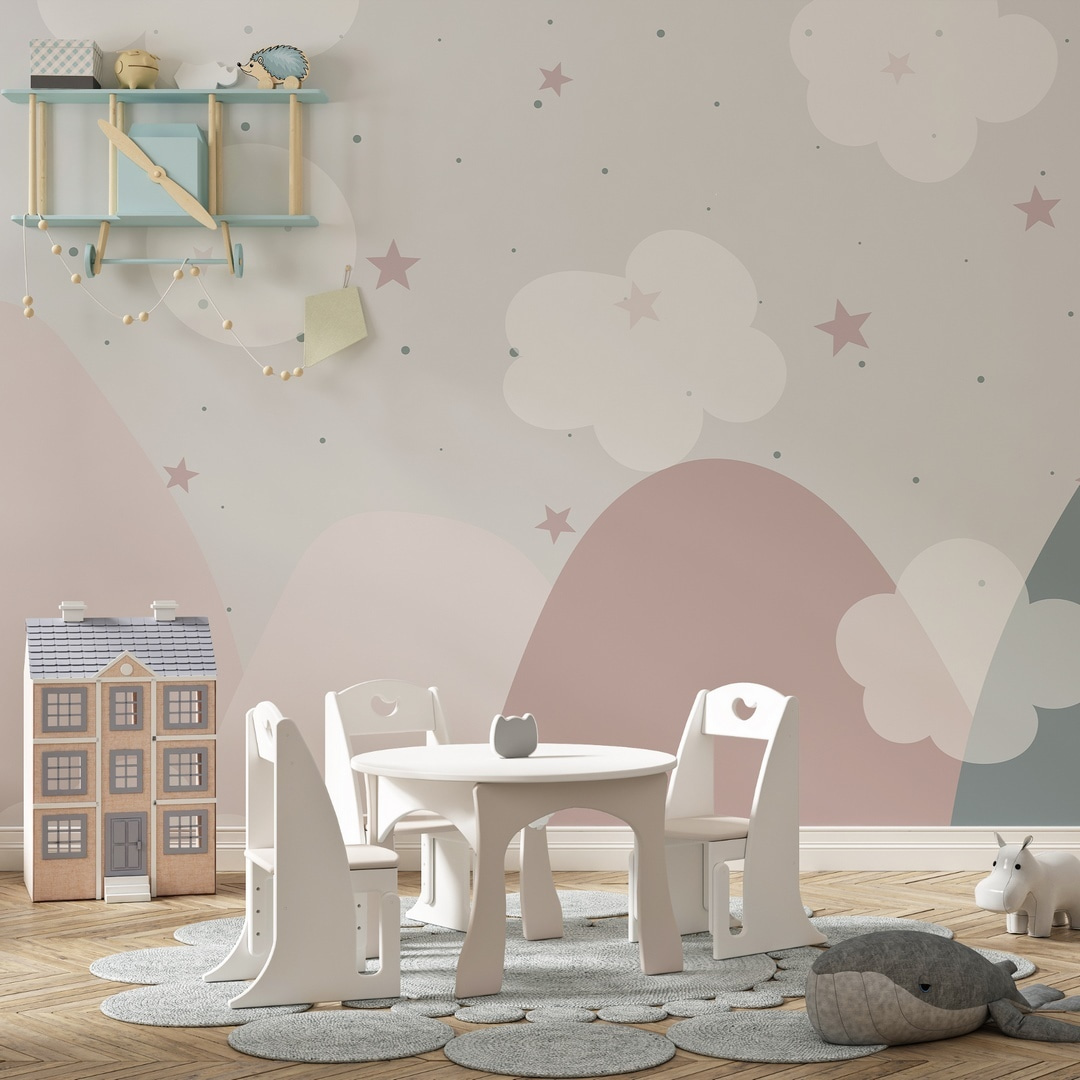 Verander elke ruimte in een dromerige ontsnapping met deze charmante muurschildering, “Landschap met wolken en sterren”. Stel je voor dat kleintjes naar deze zachte, pastelkleurige pieken, pluizige wolken en fonkelende sterren staren terwijl ze in slaap vallen. Het is als een uitnodiging om vanuit hun kamer een grillige wereld te verkennen! De zachte kleuren creëren een gevoel van rust, waardoor het perfect is voor speeltijd of rustige momenten. Beeld je verhaaltjes in onder deze betoverende hemel – het zal zeker tot fantasierijke avonturen aanzetten. En wie houdt er niet van een uitzicht dat hem het gevoel geeft dat hij tussen de wolken aan het luieren is?