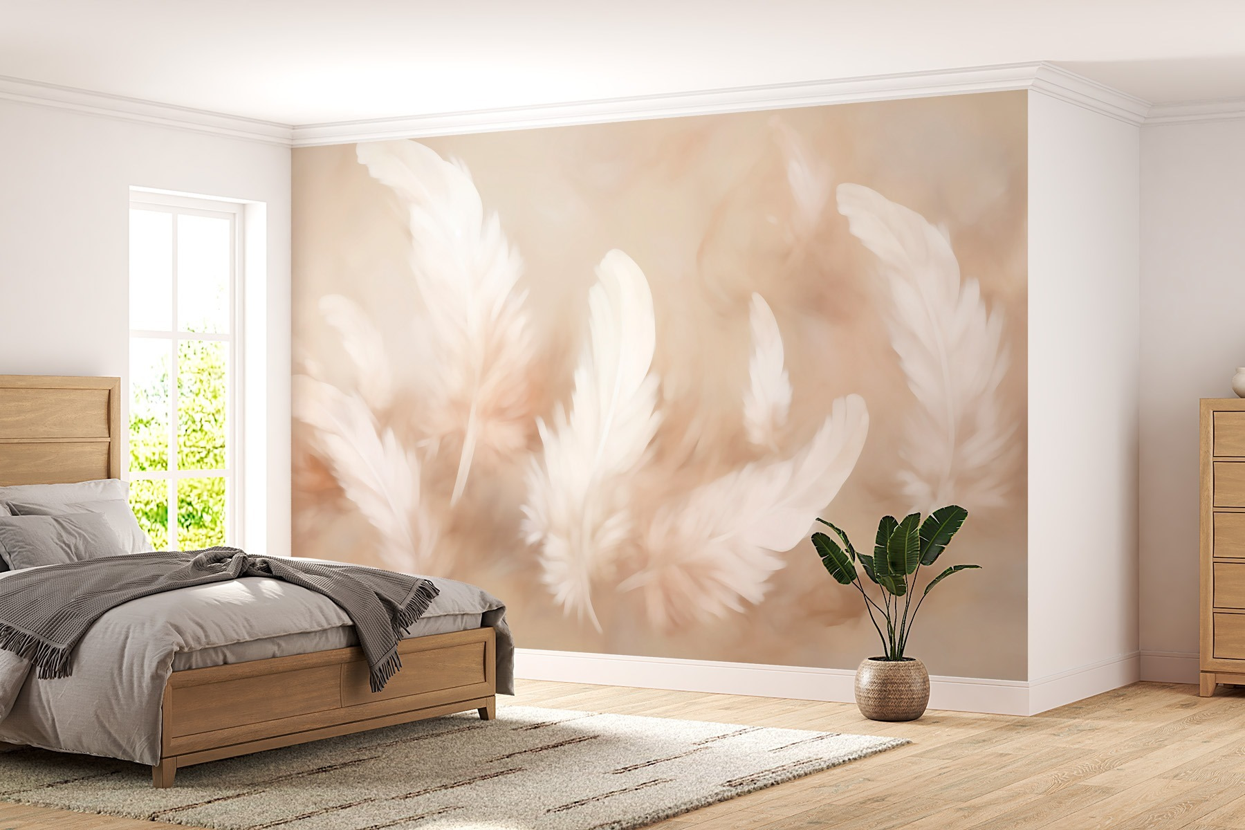 Transformeer je ruimte met deze serene muurschildering “Groep witte veren”. Het is als een zacht gefluister uit de natuur, dat vrede en rust in elke kamer uitnodigt. Stel je dit zachte aquarelkunstwerk voor, zacht fladderend op je muur – veren zwevend tussen warme, aardse tinten die aanvoelen als een knusse knuffel.