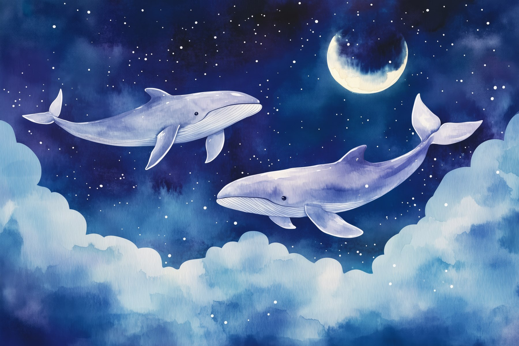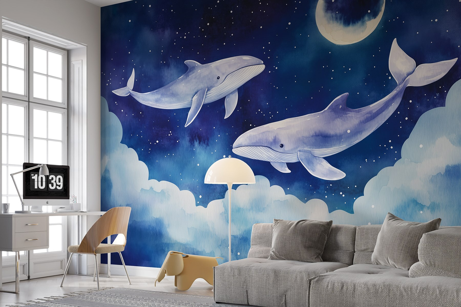 Tover elke ruimte om in een dromerige ontsnapping met de muurschildering “Two Whales in the Sky”. Stel je voor: zachte reuzen die door een schemerige vlakte glijden, omringd door wolken met sterren en een vriendelijke maan. Het is alsof je een stukje oceaan in huis haalt, zonder de geur van zeewier. Deze muurschildering is perfect voor de sfeer aan zee of een gezellig hoekje en geeft een vleugje eigenzinnigheid en sereniteit, waardoor het een gespreksstarter wordt voor gasten. Stel je voor dat je koffie drinkt terwijl je naar die walvissen staart en je afvraagt waar ze over dromen. Een betoverende toets voor iedereen die op zoek is naar een beetje magie in zijn interieur!