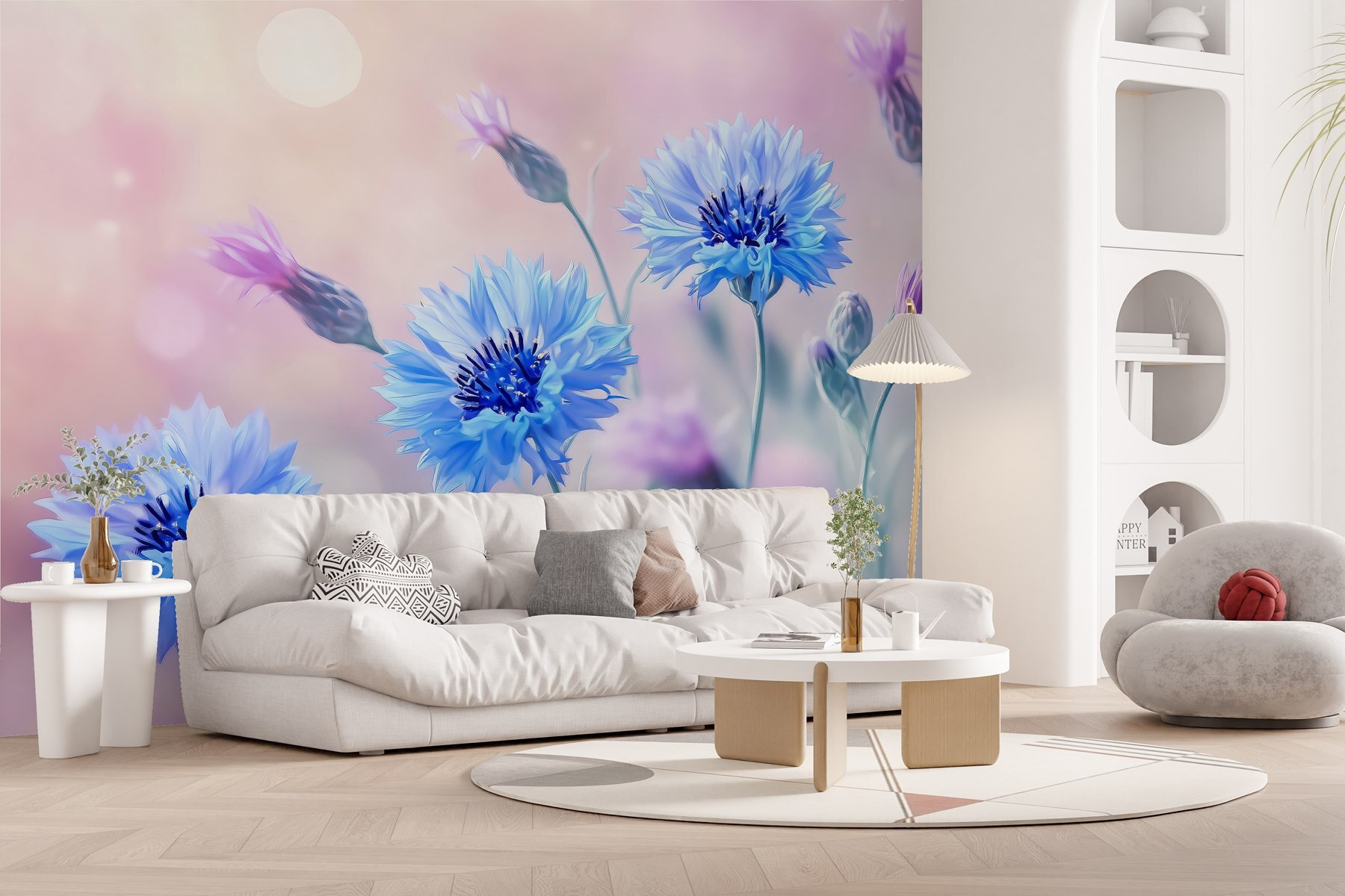 Fleur je muren op met deze betoverende muurschildering met een prachtige groep blauwe bloemen. Stel je voor dat je een serene tuin binnenstapt telkens als je de kamer binnenkomt. Dat zachte aquareleffect zorgt voor een dromerige sfeer, toch? De zachte blauwe tinten zijn als een koel briesje op een warme zomerdag – verfrissend en rustgevend tegelijk. Perfect voor een slaapkamer of een gezellig leeshoekje, het creëert een vredig toevluchtsoord. Bovendien hoef je deze schoonheden geen water te geven; ze zullen niet snel verwelken! Gezellige sfeer, moeiteloze stijl – wat is er niet leuk aan?