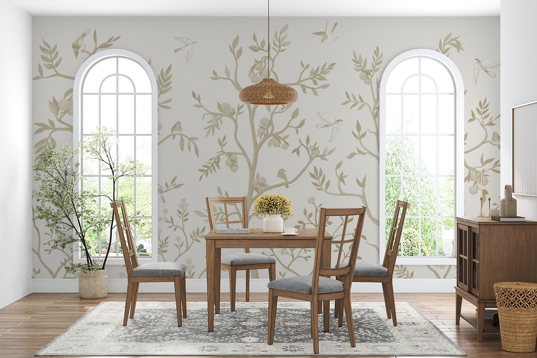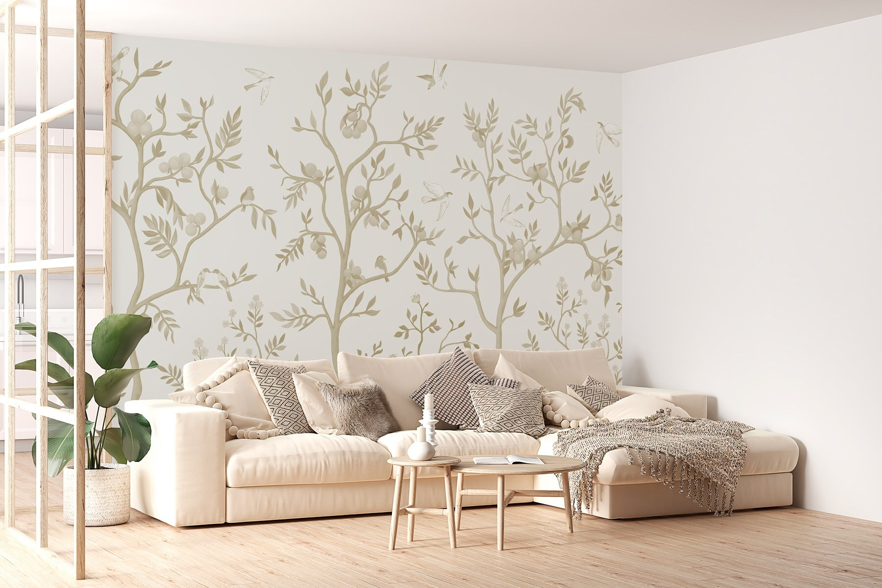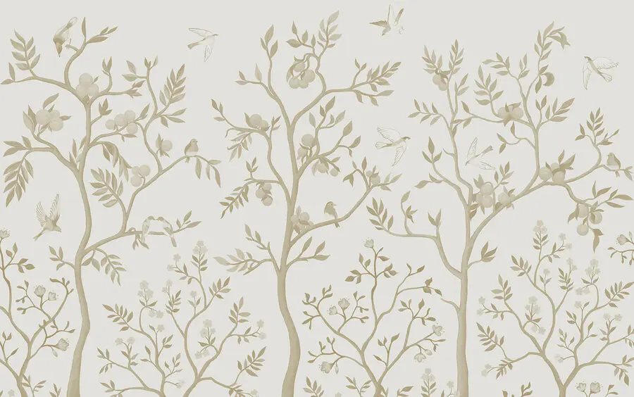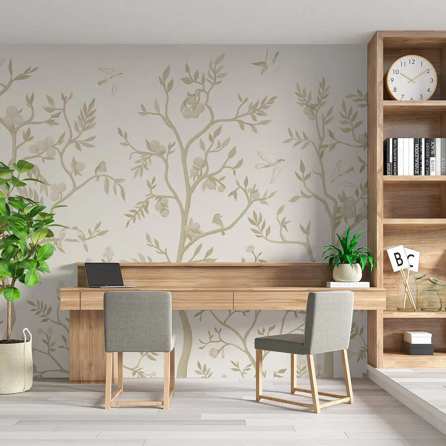 Transformeer elke ruimte met deze betoverende muurschildering met delicate vogels en sierlijke bomen, perfect om een stukje natuur in huis te halen. Stel je voor dat je ‘s ochtends aan je koffie nipt terwijl de vogels lijken te kwetteren, hun gefluister vermengend met de zachte tinten van een rustige tuin. Deze muurschildering kleedt niet alleen je muren aan, maar nodigt ook uit tot een rustige sfeer, waardoor zelfs de meest alledaagse kamers aanvoelen als een vredig toevluchtsoord. Als huizen persoonlijkheden hadden, zou dit de zachtaardige vriend zijn die je altijd op je gemak weet te stellen. Het is alsof je een serene natuurwandeling in je woonkamer maakt – zonder de insecten! Of het nu in een gezellig hoekje is of in een lichte gang, het zal zeker een gespreksstarter zijn. Dus, laat die muren zingen!