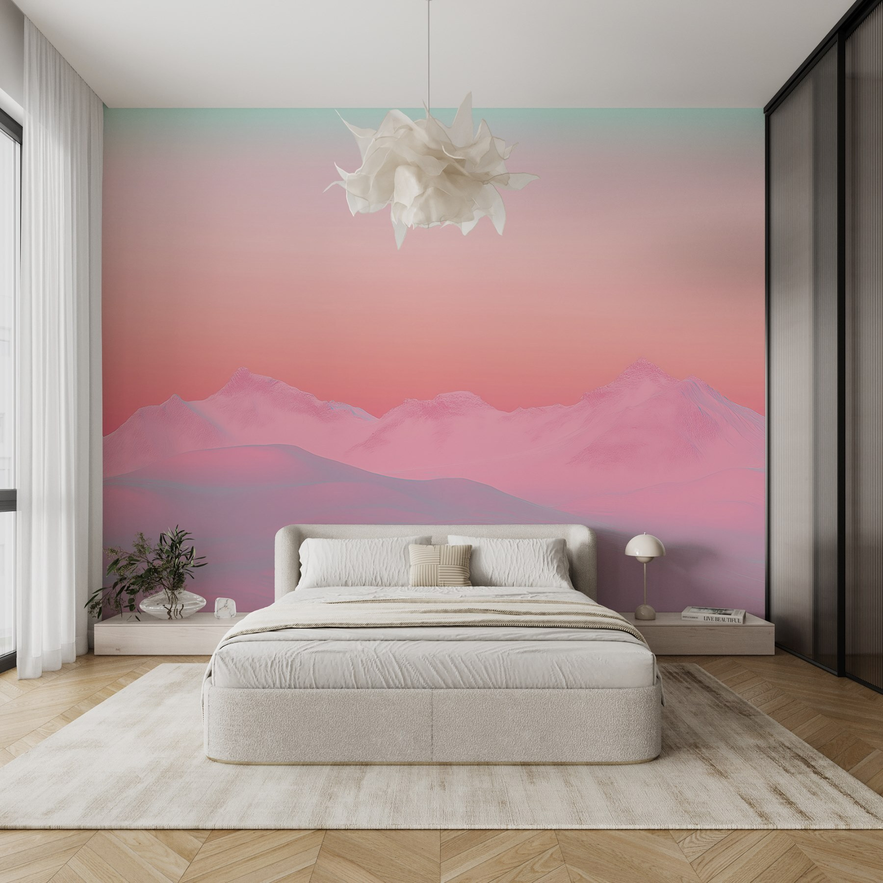 Transformeer je ruimte met de dromerige “Fotobehang Pink and Blue Sky Over a Snowy Mountain Range”. Stel je voor dat je wakker wordt met deze zachte mix van roze en azuurblauw, die een serene achtergrond creëert die stress doet wegsmelten. Het voelt als een zachte knuffel van de natuur – perfect voor die kille ochtenden met een gezellig kopje koffie in de hand. Of je nu luiert op de bank of tot rust komt na een lange dag, deze muurschildering fluistert rust uit. Het is niet alleen decor; het is een ontsnapping, een mini-vakantie naar pasteltoppen die uitnodigt tot dagdromen en rust in elke kamer. Wie zou dat niet willen?