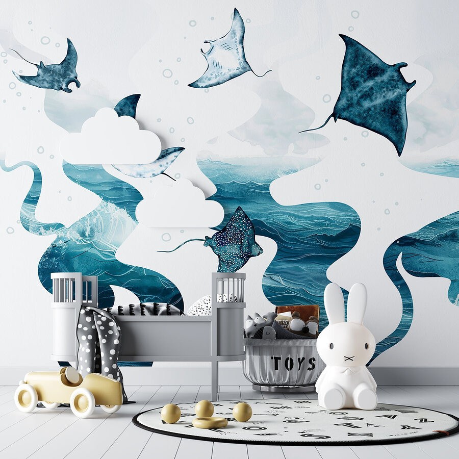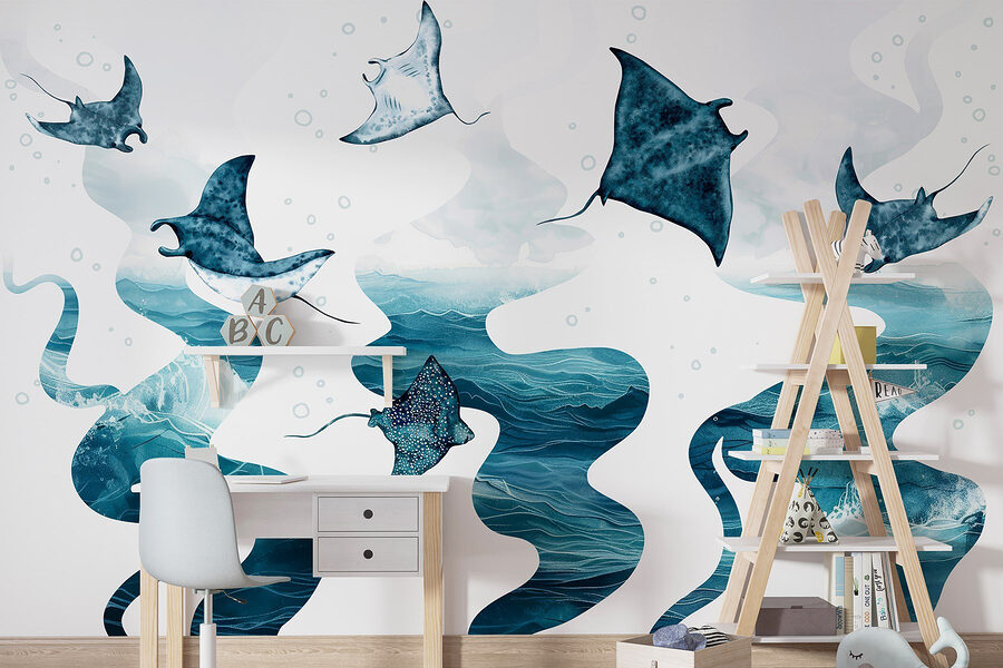 Tover elke ruimte om in een serene onderwaterwereld met deze prachtige muurschildering van roggen die sierlijk door het water glijden. Stel je voor dat je een kamer binnenstapt waar de rustgevende blauwe tinten een kalme sfeer creëren, bijna alsof je thuis op minivakantie bent. De moeiteloze stroom van het ontwerp zal je doen dromen van oceaangolven en zachte briesjes, waardoor het perfect is voor een strandhoek of een relaxte woonkamer. En wie houdt er niet van roggen? Ze zijn als de vriendelijke reuzen van de zee en brengen een vleugje verwondering en een vleugje persoonlijkheid naar je muren. Het is niet alleen decor; het is een dagelijkse herinnering aan de schoonheid van de natuur, subtiel inspirerend voor ontspanning en dagdromen over ontsnappingen aan zee. Duik in deze muurschildering en laat je verbeelding de vrije loop!