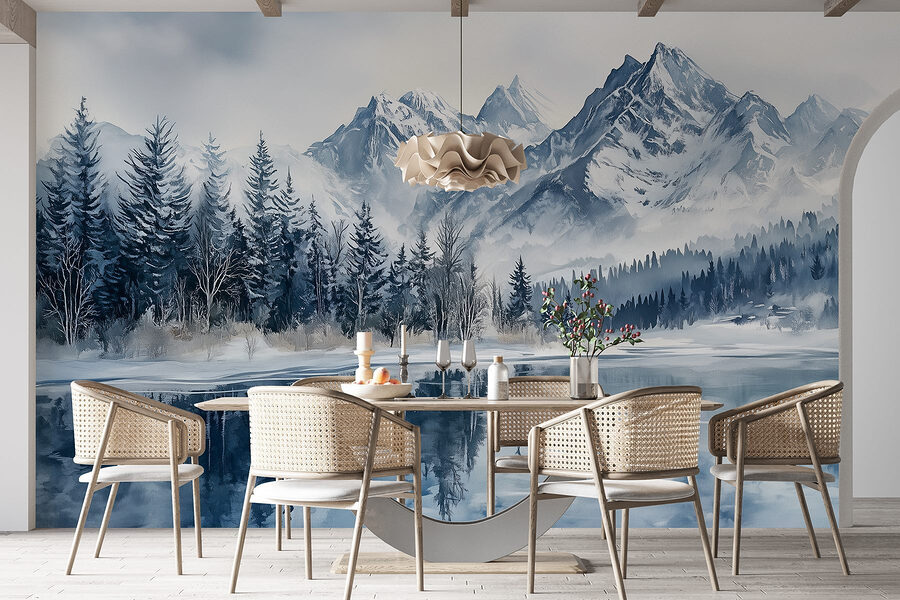Tover je ruimte om in een winterwonderland met deze prachtige muurschildering van een sereen meer omringd door besneeuwde bergen en bomen. Het zachte aquareleffect nodigt uit tot een kalme sfeer, perfect om gezellig een kopje thee te drinken of om te doen alsof je een bergwachter bent voor een dag. Stel je voor dat je het zonlicht op het water ziet dansen terwijl die bergtoppen je gezelschap houden. Het is een stukje natuur in je woonkamer. Bovendien heeft sneeuw iets waardoor alles fris en vredig aanvoelt. Wie wil dat nou niet? Maak van je muren een canvas voor dromen en verdwaal in de schoonheid van de winter, het hele jaar door!