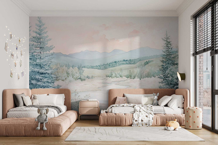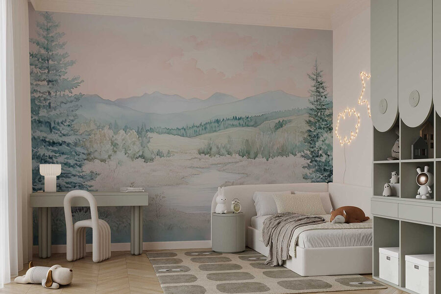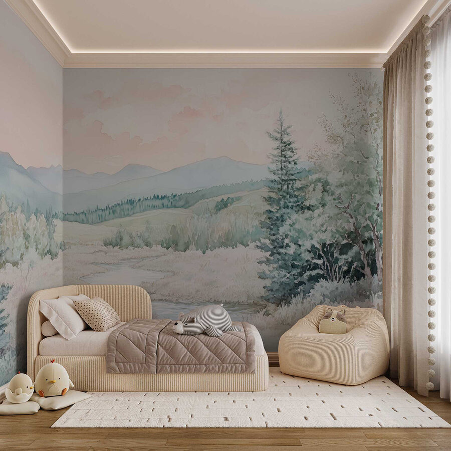 Verander een effen muur in een serene ontsnapping met deze betoverende aquarelmuurschildering van een rivier die door een weelderige vallei kronkelt. Deze schoonheid bevat zachte pasteltinten en zachte penseelstreken, waardoor het aanvoelt als een knusse knuffel voor elke ruimte. Stel je voor dat je ‘s ochtends aan je koffie nipt terwijl je naar dit vredige tafereel staart – het is net een mini-vakantie bij je thuis. Perfect voor slaapkamers of woonkamers, het voegt een rustgevende sfeer toe die zelfs de drukste dagen kan kalmeren. Bovendien zullen natuurliefhebbers zich hier thuis voelen, omringd door bomen en prachtige bergen. Haal een beetje buiten naar binnen en laat je muren een verhaal van rust vertellen!
