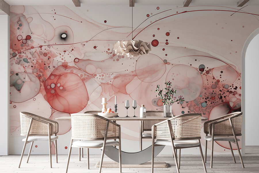 Verander elke ruimte in een serene oase met deze prachtige muurschildering: “Vloeiende vormen en kleuren lopen prachtig in elkaar over. Het is alsof er een zachte rivier van kleuren door je kamer stroomt, die uitnodigt tot kalmte en de geest tot rust brengt. Stel je voor dat je een kopje thee drinkt, naar deze dromerige wervelingen staart en je zorgen voelt wegdrijven – pure gelukzaligheid! Het aquareleffect brengt leven aan je muren, stimuleert creativiteit en gesprekken. De zachte tinten en abstracte vormen van deze muurschildering zijn perfect voor een gezellig leeshoekje of een levendige werkruimte en zullen zeker in het oog springen en je hart verwarmen.