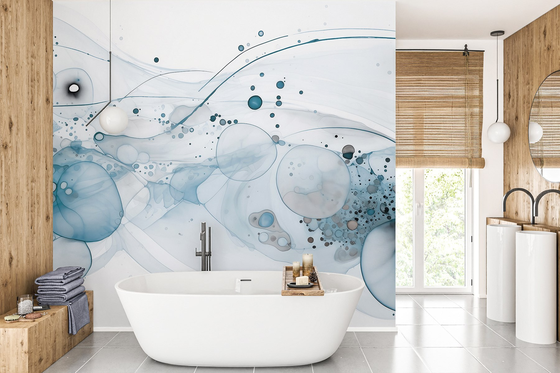 Verander je ruimte in een dromerige ontsnapping met “Etherische golven van gedempte kleuren”. Deze muurschildering fluistert rust uit en spat zacht blauw en zacht grijs over de muur als een kalme zee op een winderige dag. Stel je voor dat je elke ochtend wakker wordt en deze vloeiende schoonheid ziet. Het is alsof je een sereen kunstwerk hebt dat beweegt met het licht.