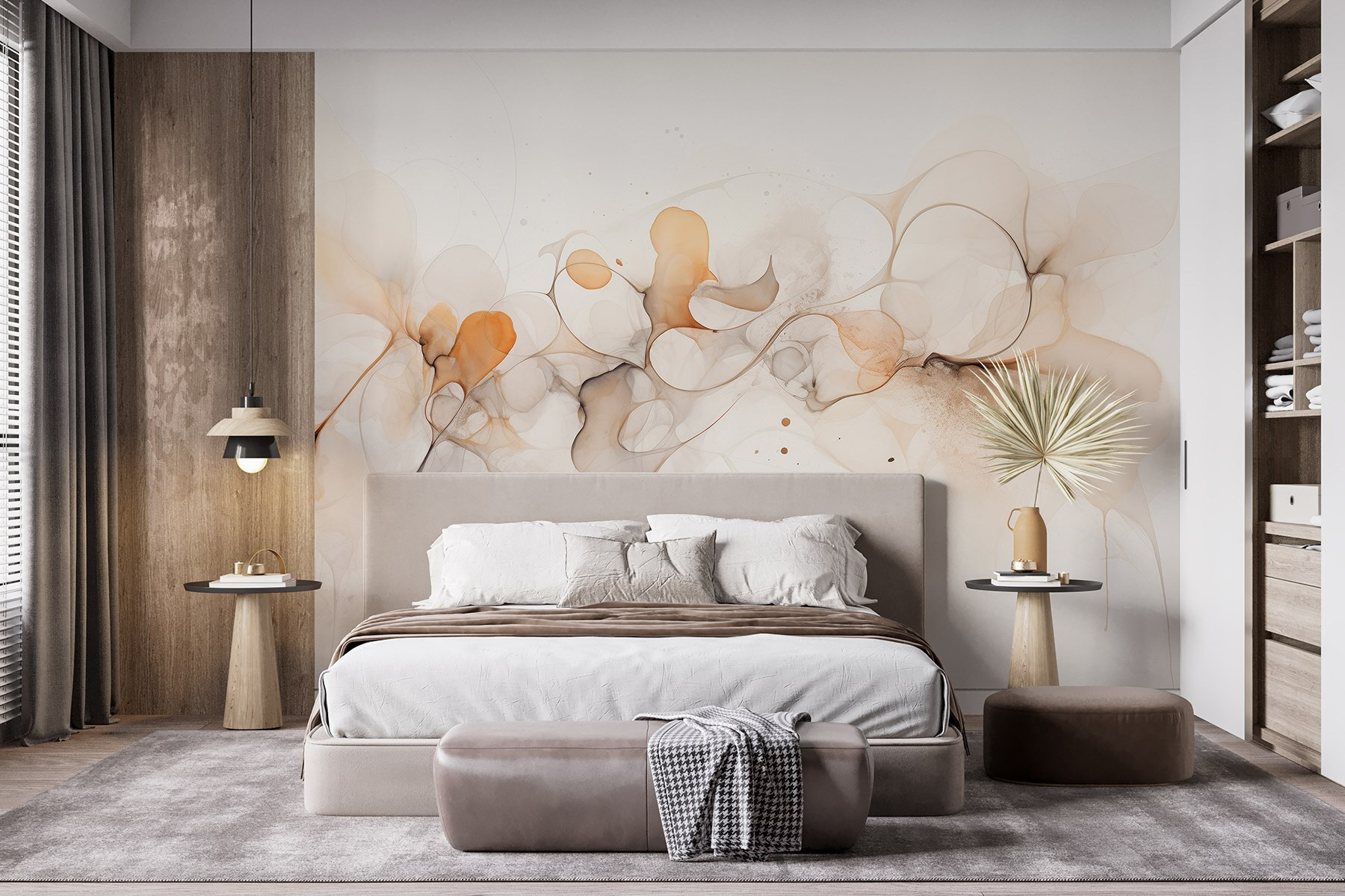Tover elke kamer om in een rustgevende oase met de muurschildering “Soft Swirls of Earthy Tones”. Stel je voor dat je de zachte vibraties opsnuift terwijl deze zachte wervelingen over de muren dansen en je meevoeren in een wereld van serene schoonheid. Perfect voor die leeshoek waar je thee drinkt en doet alsof je productief bent of de woonkamer waar geïmproviseerde dansfeestjes plaatsvinden. Elke aardetint fluistert naar de natuur en biedt een knusse omhelzing zonder de zintuigen te overweldigen. Het is alsof je je muren een warme knuffel geeft – wie houdt daar niet van? Dus ga je gang, laat deze muurschildering de frisse wind zijn waar je ruimte naar verlangt!